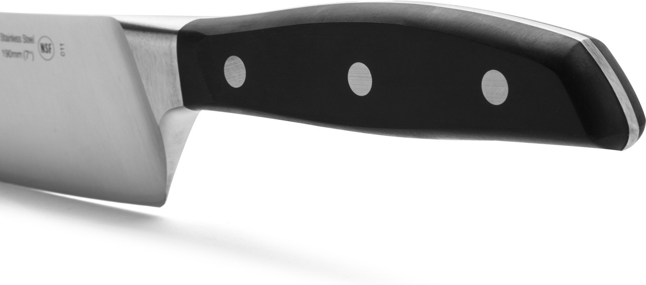En smidd kockkniv av hög kvalitet med ett 19 cm långt blad, väl lämpad som brukskniv i köket. Inspirerad av japanska santoku- och körsbärsknivar. Det smidda bladet har en gungande rörelse, så det är lätt att skära kött, fisk och grönsaker. ARCOS knivarna är professionella verktyg med utmärkt valuta för pengarna. Knivarna är tillverkade enligt den spanska knivtillverkningstraditionen i provinsen Albacete sedan 1745 och är gjorda av smidd Nitrum rostfritt stål med en hårdhet på C56 på Rockwell-skalan. Även detta stål tillverkas i Spanien.
