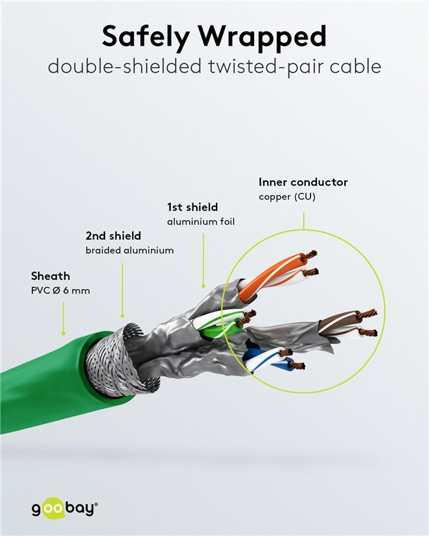 - Böjskydd och stabilt mantel skyddar Ethernet-kabeln optimalt mot kabelbrott.