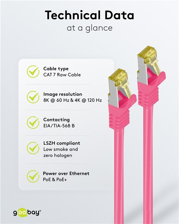 - CAT-7-kabeln är lämplig för Power over Ethernet (PoE, PoE+) och 10 Gigabit Ethernet med hastigheter upp till 10/100/1000/10000 Mbit/s.