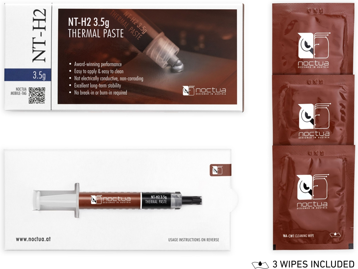 NT-H2 är en förbättrad version av Noctuas prisbelönta värmeledande pasta. NT-H2, som ytterligare förbättrar den prisbelönta NT-H1, använder en ny, finjusterad blandning av metalloxidmikropartiklar som möjliggör ännu bättre värmetålighet och minskar fogens tjocklek vid installationer. Tack vare sin utmärkta prestanda, exceptionella användarvänlighet och utmärkta långsiktiga stabilitet har den blivit en etablerad favorit bland överklockare och PC-byggare.