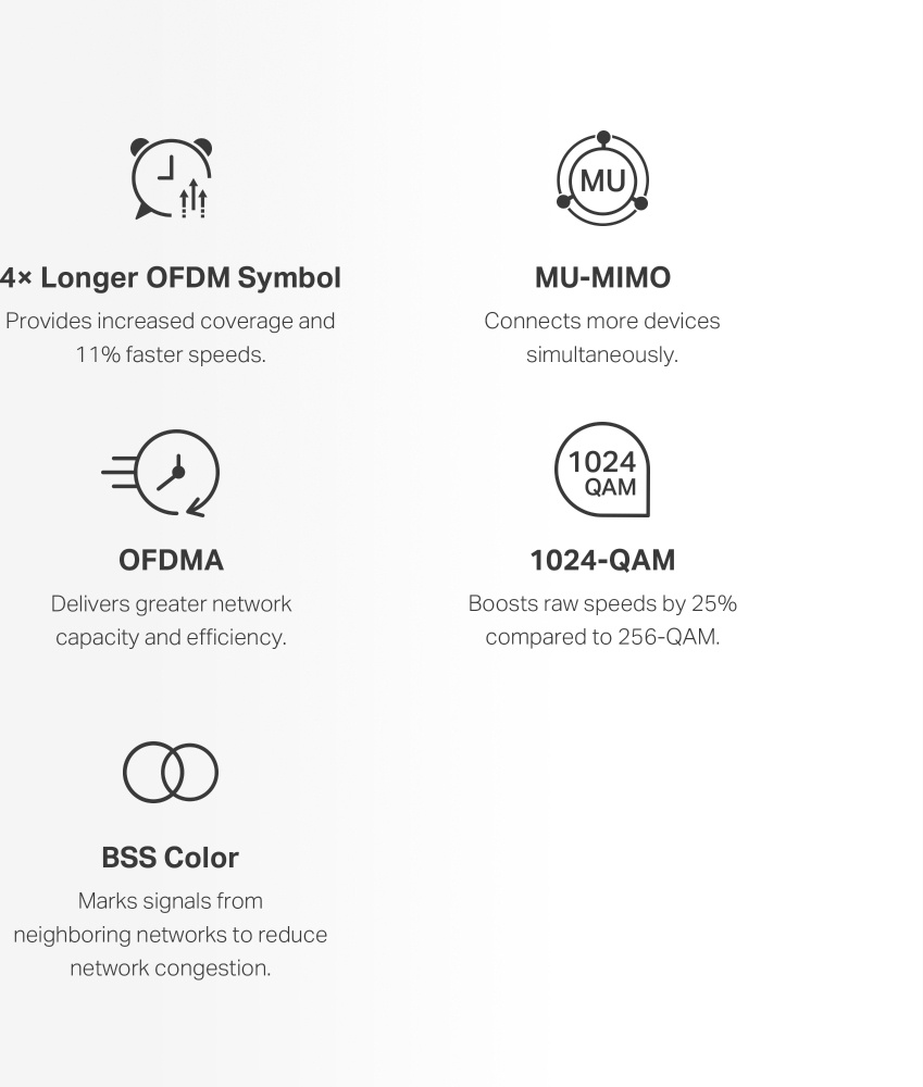 Det nya generationens blixtsnabba 802.11ax WiFi-systemet erbjuder hastigheter på upp till 1500 Mbps för fördröjningsfritt spelande, smidig uppspelning av 4K UHD-video och extremt snabb fildelning. Det ökade antalet personliga enheter och IoT-enheter som är anslutna till nätverket har lett till en allmän belastning på nätverket, vilket redan sätter den nuvarande WiFi-standarden på prov. Den senaste standarden, 802.11ax, som numera kallas WiFi 6, erbjuder framtidssäker teknik, bättre nätverksutnyttjande, snabbare WiFi-anslutningar, bättre täckning samt längre batteritid för enheter som är anslutna till nätverket, vilket i sin tur förbättrar nätverksupplevelsen avsevärt.