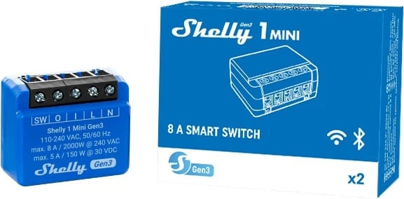 Shelly 1 Mini Gen3 är en mycket kompakt Wi-Fi-styrd smart strömbrytare för smart styrning. Shelly Med 1 Mini Gen3-kontrollen kan du automatiskt styra belysning, garageport, bevattningssystem eller andra små elektriska apparater både hemifrån och när du är bortrest. Shelly 1 Mini Gen3 är tillräckligt liten för att passa i nästan alla väggströmbrytare eller eluttag och kan även installeras i efterhand.