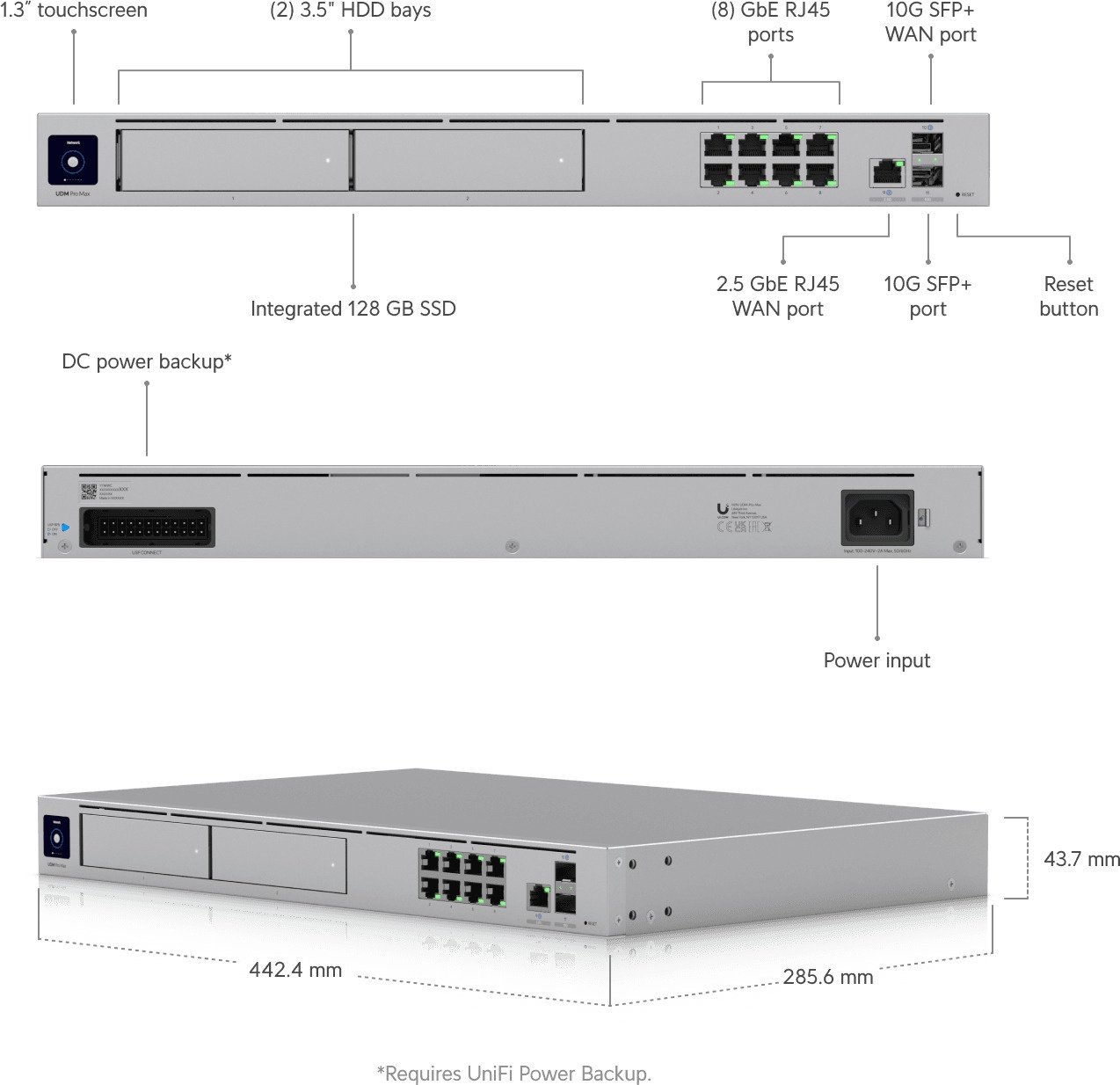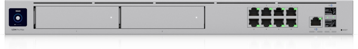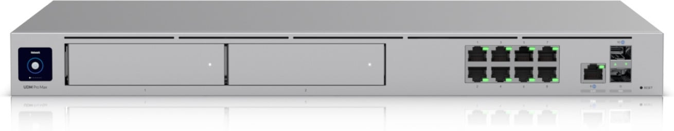 Ubiquiti UniFi Dream Machine Pro Max är en allt-i-ett-enhet för stora och medelstora företag. Enheten kombinerar bland annat brandvägg, snabb Multi-WAN med lastbalansering (10G SFP+ och 2,5 GbE RJ45-portar), UniFi-kontroller, 128 GB inbyggd hårddisk och två NVR 3,5-tums hårddiskplatser med RAID-stöd.