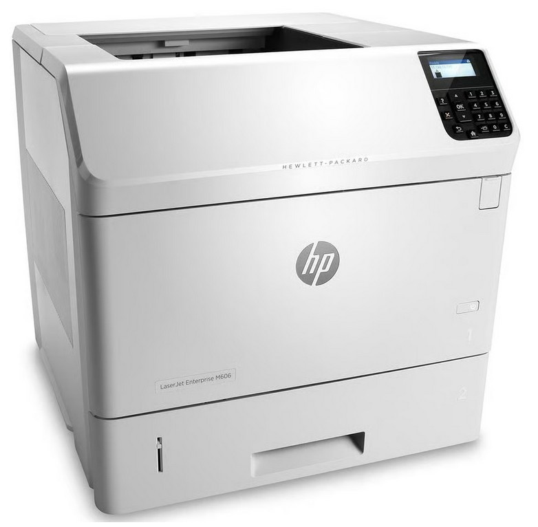 HP Color LaserJet Enterprise M606 skrivare med utskrift, nätverksanslutning och automatisk dubbelsidig utskrift. Enheten är avsedd för kontorsbruk och har en kompakt design i vit färg.