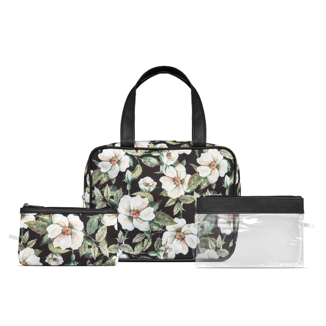 3-delat necessärset i svart tryck med vita blommor. Allt du behöver Stor kosmetikväska med 2 handtag och med inredning som består av 2 lika stora nätfickor som ger dig en bra överblick över dina skönhetsprodukter, det finns också en stor ficka med dragkedja. Dessutom en sminkväska, för t.ex. elektronik när du är på språng, eller för att använda som en clutch för en utekväll. och en incheckningsväska i PVC-fri plast som uppfyller gällande IATA-regler.