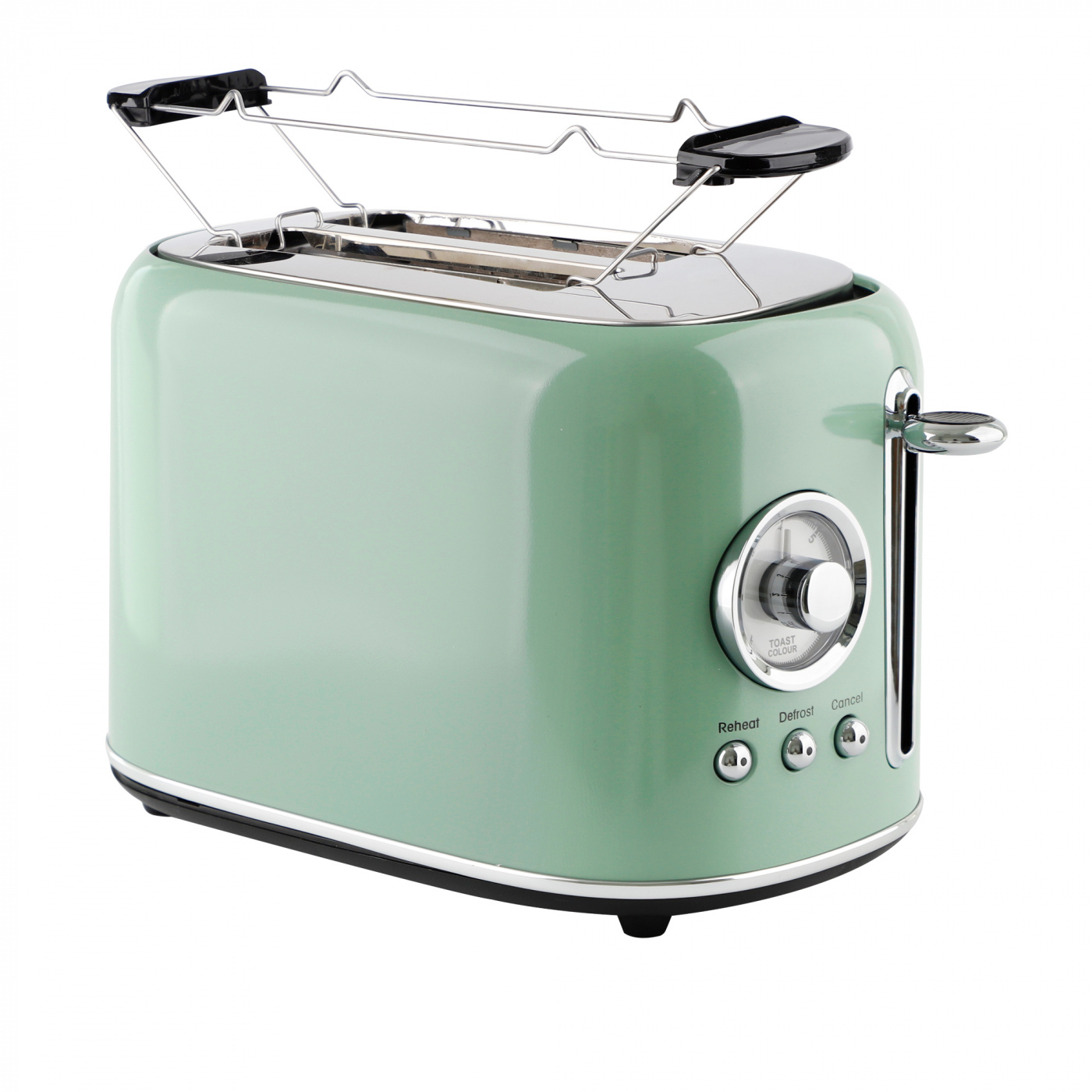Brödrosten är snyggt designad i retrostil i grönt rostfritt stål. Funktioner som autocentrering och upptining- och uppvärmningsfunktion gör denna brödrost till något alldeles extra. Dessutom är brödrosten utrustad med automatisk popup, stoppknapp och en utdragbar smulsamlare för enkel rengöring. De praktiska gummifötterna på undersidan stabiliserar brödrostens placering.