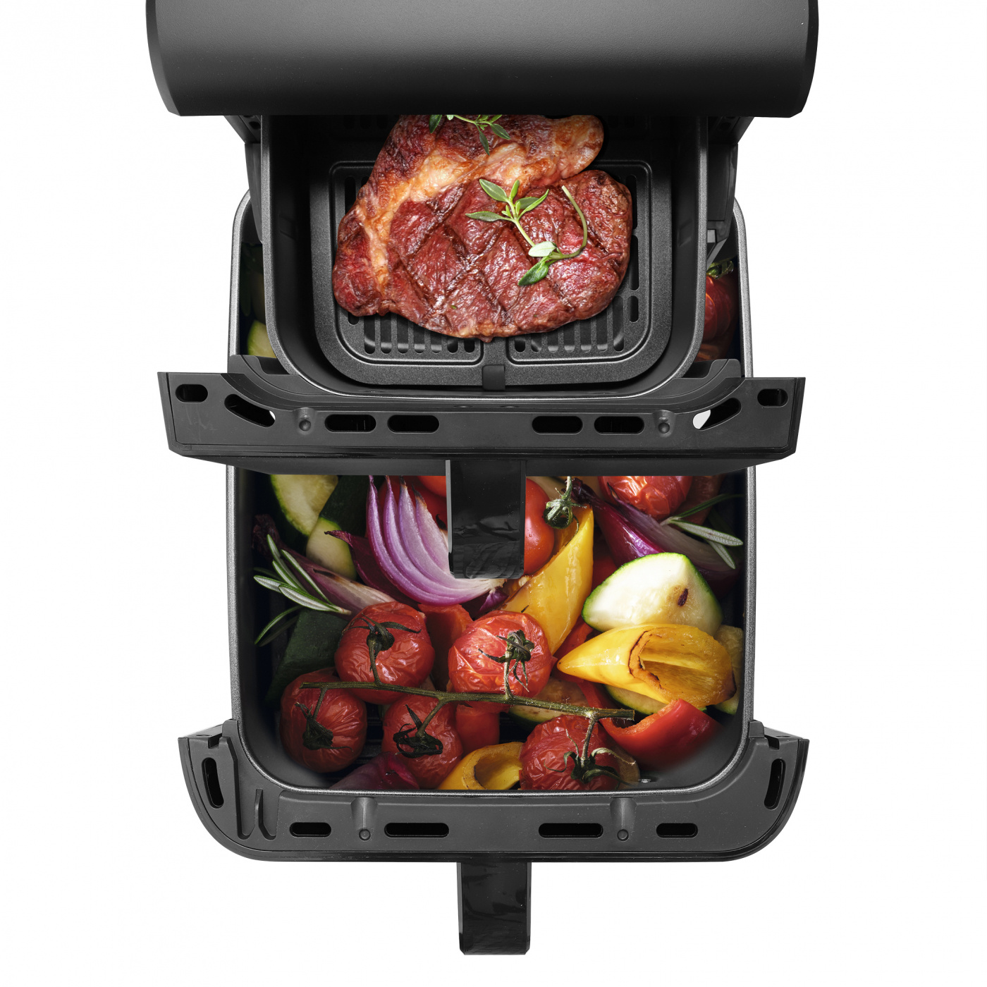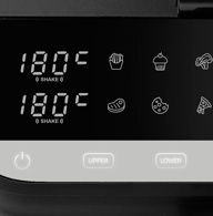 värmeelement och kan styras separat. Det finns även en synkfunktion så man kan få de bägge korgarna att få maten klar samtidigt.