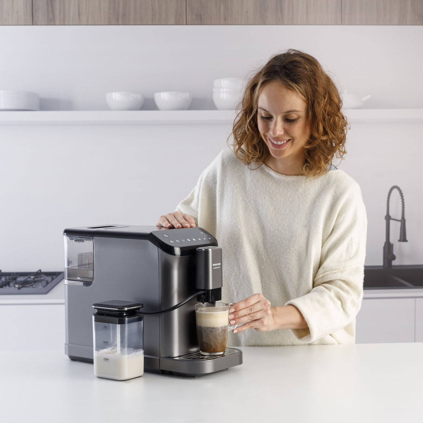 Maskinen är utrustad med en mjölktank som gör det enkelt att tillreda cappuccino. Den justerbara kvarnen och touch-systemet med fyra förprogrammerade drycker ger en personlig kaffeupplevelse. Underhållet är enkelt tack vare AlwaysClean-systemet och de löstagbara delarna.