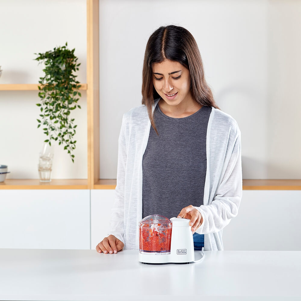 Hacka mat som kött, kryddor, grönsaker, nötter, ost och mycket mer med BLACK+DECKER-hackaren. Med dess 120W kraft kommer du att kunna hacka och krossa önskad mat på kort tid.