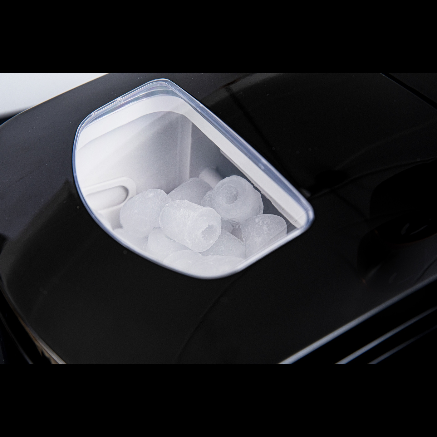 Maskinen är mycket användarvänlig - fyll behållaren med vatten, välj önskad isbitstorlek på knapparna på ovansidan och starta maskinen. Den stängs av automatiskt när isbehållaren är full och en LED-lampa indikerar när det är dags att fylla på vatten.