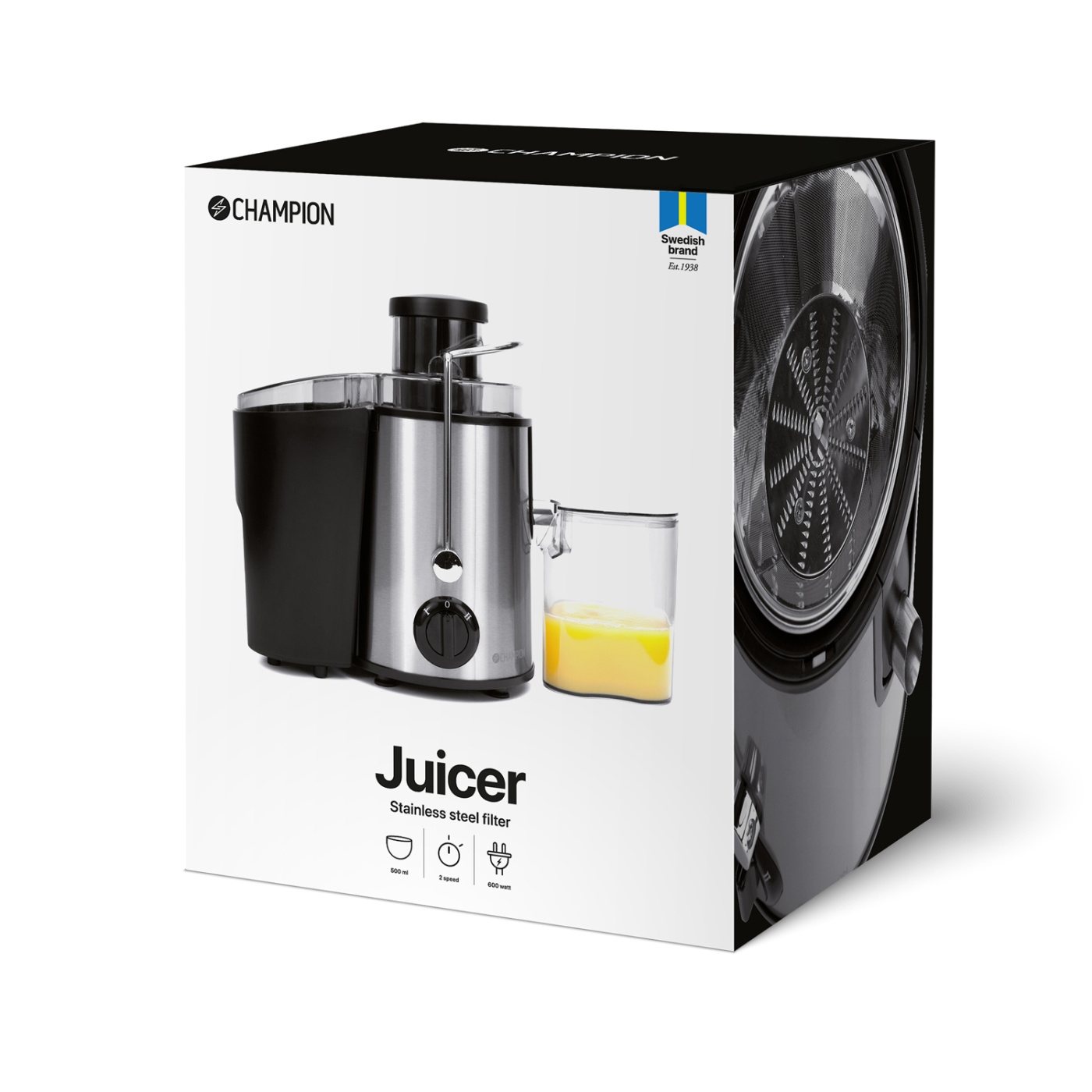 Med Champions Råsaftcentrifug RS400 kan du njuta av färskpressad slät juice och hälsoshots utan fruktkött på ett enkelt och nyttigt sätt. Välj ut dina ingredienser och låt råsaftcentrifugen göra jobbet – den kraftfulla motorn pressar saften ur både frukt och grönsaker. Filter samt blad är tillverkade i rostfritt stål och är avtagbara för enkel rengöring.