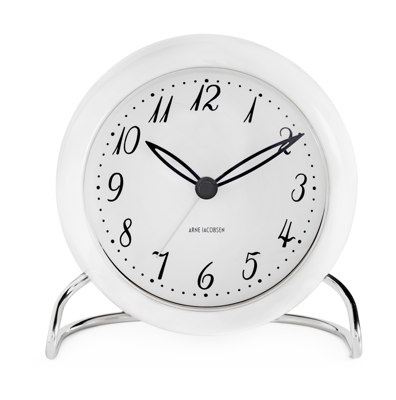 LK bordsklockan av Arne Jacobsen såg dagens ljus 1939, och med sin arkitektoniska och minimalistiska design har klockan blivit ett klassiskt och populärt designelement i det moderna hemmet. Den vackra bordsklockan är designad i vit plast med vit urtavla och tydliga siffror och visare. Enkel och klassisk design från Arne Jacobsen. Klockan mäter 11 cm i diameter och 12 cm i höjd.