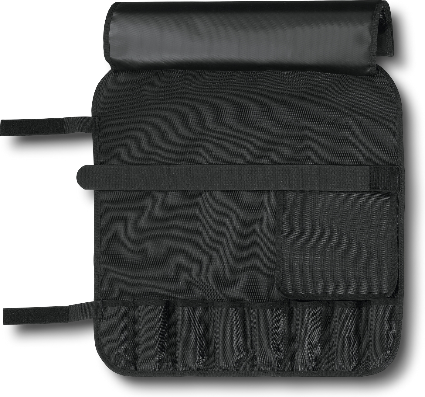 Knivfodralet Victorinox är tillverkat av slitstark och lättstädad PVC/polyester och kan smidigt rullas ihop. Väskan har en ficka för en namnskylt, en separat flik som täcker de små knivarna och ett kardborreband som håller de stora knivarnas blad på plats.