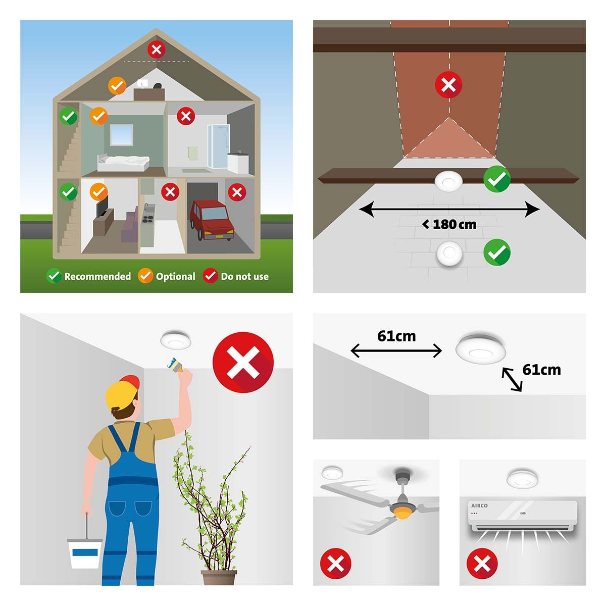 Den här kompakta brandvarnaren från Alecto är lämplig för vägg- och takmontage och är lätt att montera på önskad plats. För att göra det ännu enklare levereras den med en monteringsbas, skruvar och pluggar. Så snart brandvarnaren klickas fast på monteringsplattan aktiveras detektorn. De bästa platserna att placera brandvarnare på är i korridoren eller på övervåningen. Dessa är ofta utrymningsvägarna om en brand bryter ut i huset. Om du vill ha maximal säkerhet bör du installera en brandvarnare i varje rum där en brand kan uppstå. SA300 finns också i en uppsättning med 2 brandvarnare, SA300 DUO.