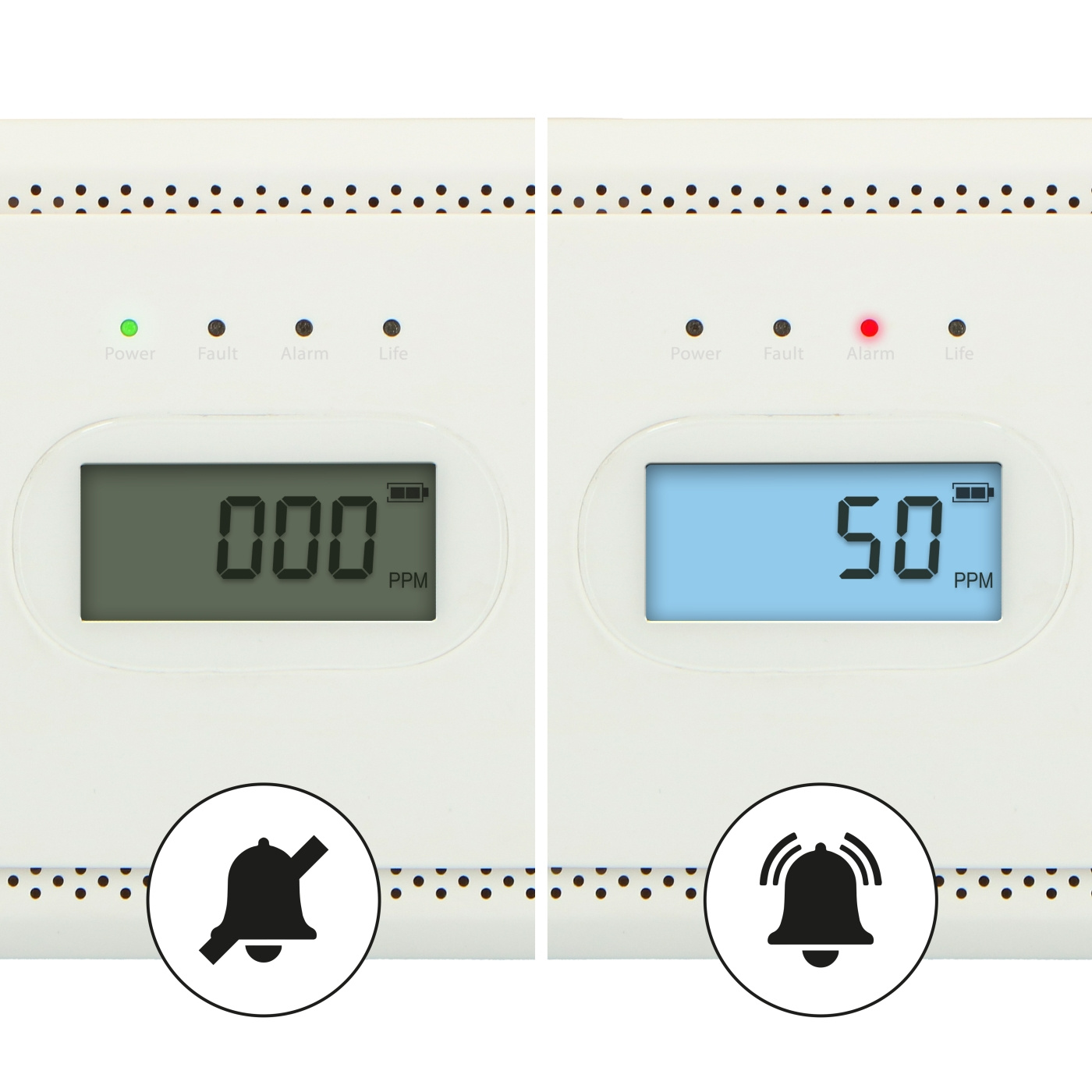 Kolmonoxidvarnare visar koncentrationen av kolmonoxid i ppm. Ppm står för parts per million, eller antal delar per en miljon partiklar. Det är lagstadgat att CO-larm ska larma vid en detekterad kolmonoxidkoncentration över 50 ppm i 60 minuter. Även när du sover kommer ett larm på >85dB inte att gå obemärkt förbi.