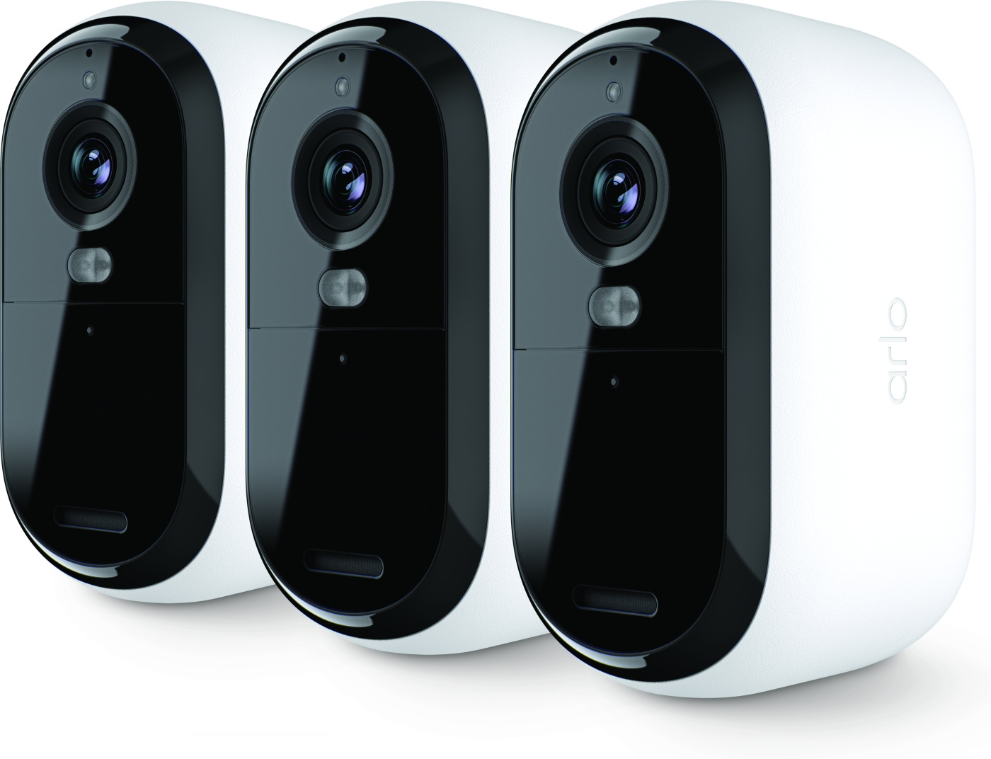 Arlo Essential 2 HD är en helt fristående övervakningskamera med 2,4 GHz Wi-Fi-anslutning. Arlo Den här produkten innehåller tre vita Essential 2 HD-kameror. Kamerorna har Full HD-upplösning, tvåvägsljud, en liten LED-lampa och en inbyggd siren, och är lämpliga för utomhus- och inomhusbruk.