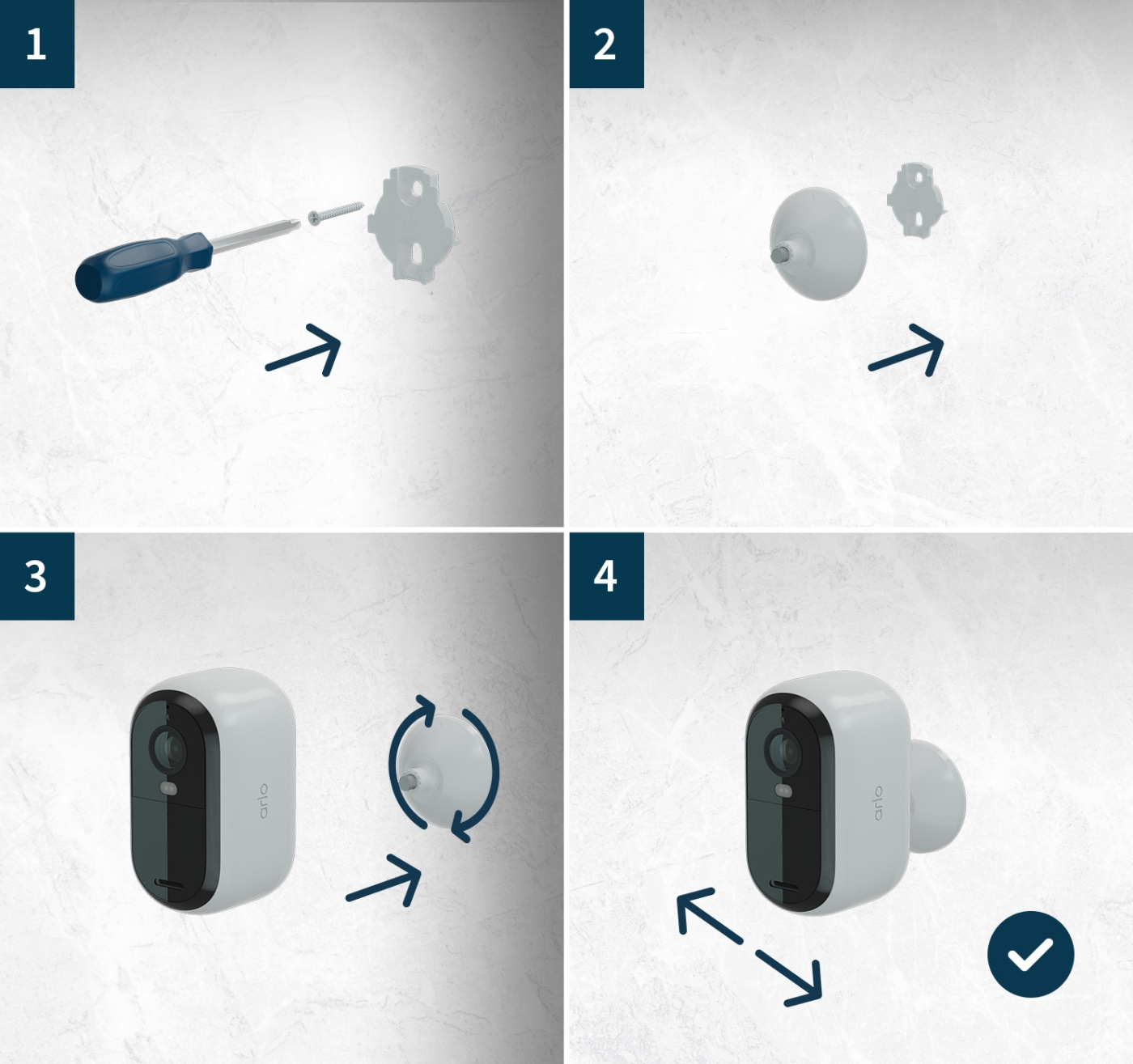 - Arlo Innehåller: 3 x Essential-kamera, 1 x USB-laddningskabel för inomhusbruk, 3 x monteringstillbehör, snabbguide