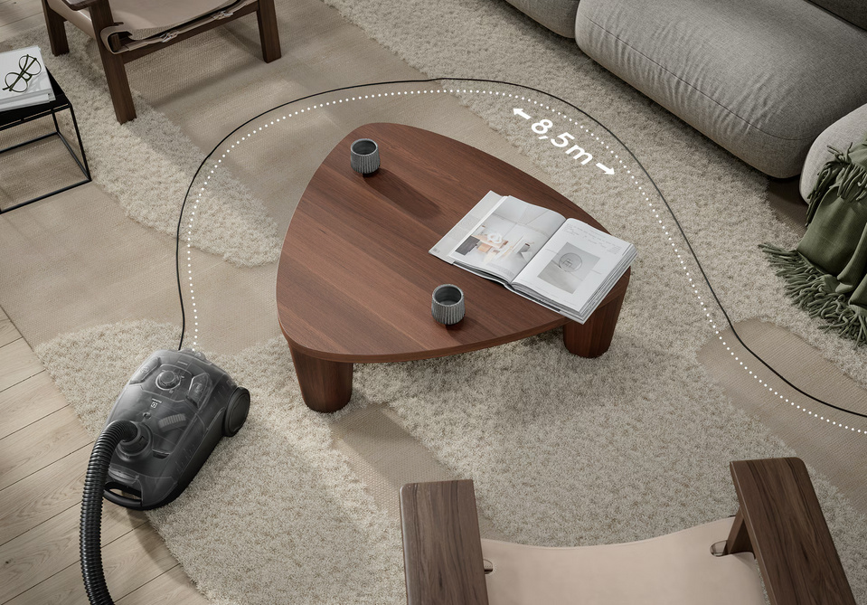 Denna ergonomiska dammsugare låter dig rengöra upp till 72 kvadratmeter utan att byta eluttag. Tack vare teleskoprör, stora hjul och 8,5 meters räckvidd kan du smidigt förflytta dig och städa utan avbrott.