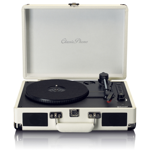 Denna Bluetooth®-skivspelare finns i färgerna svart och creme.