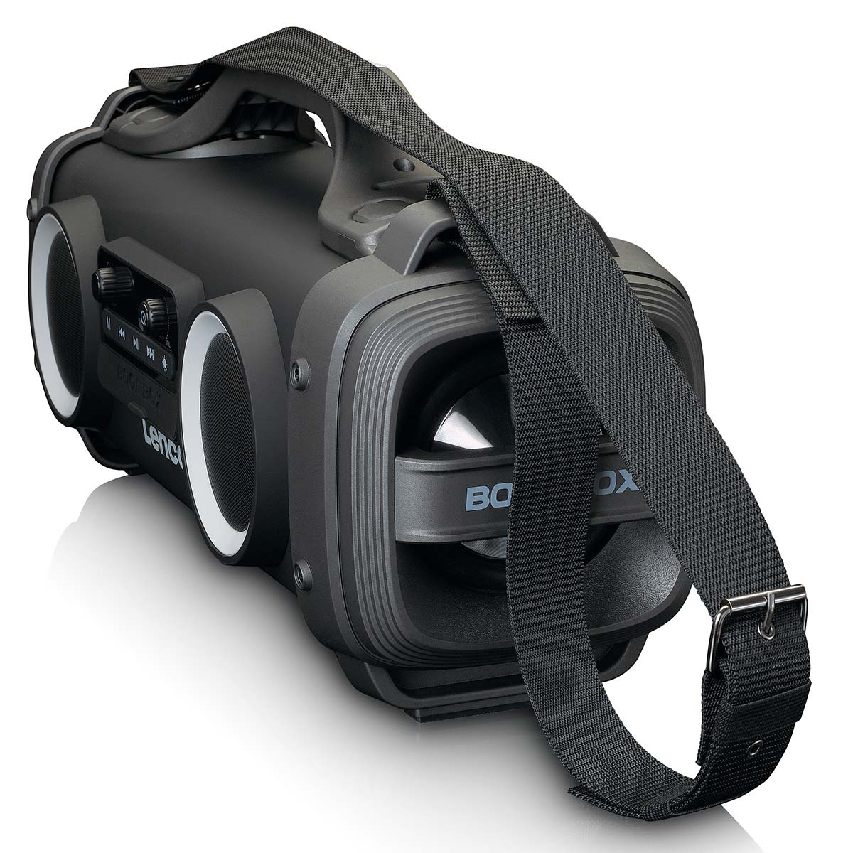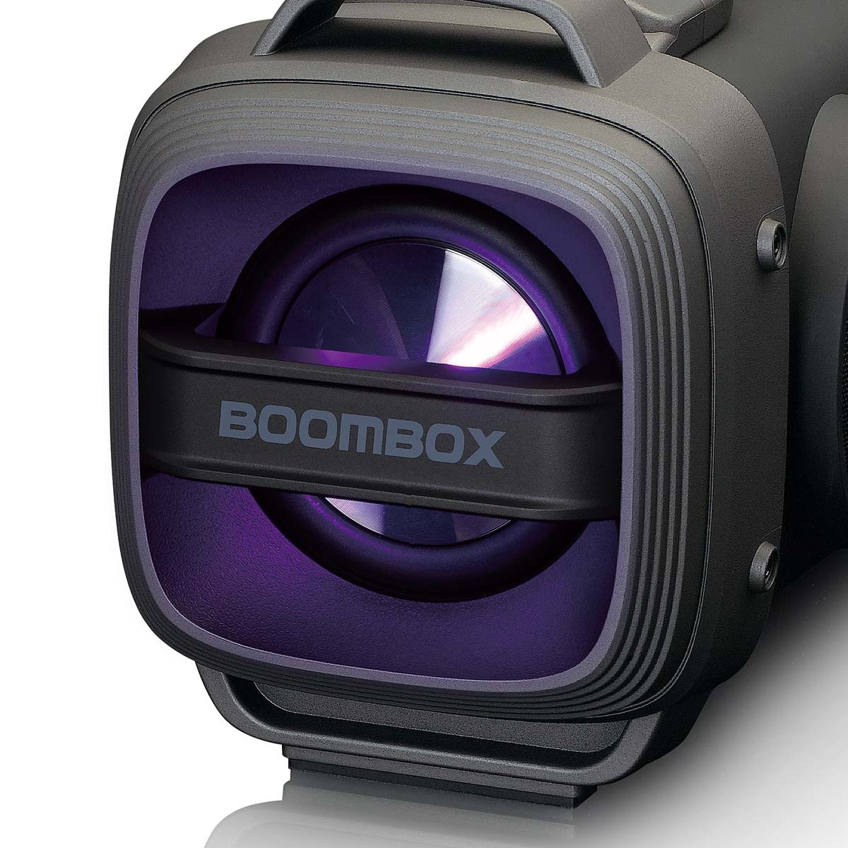 SPR-200BK är perfekt för fester inomhus eller utomhus eftersom den bärbara boomboxen har ett uppladdningsbart batteri som gör att du enkelt kan ta med dig den vart du än går. Andra viktiga funktioner är en ljudutjämnare, basjustering, axelrem och ljuseffekter.
