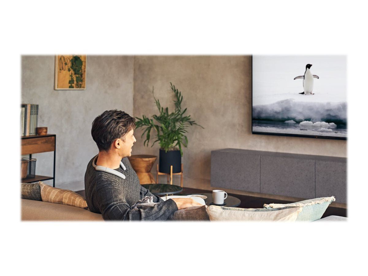 Den här nackhögtalaren har ett tydligt, personligt ljud, även i låg volym. Anslut den till en tv6, smartphone eller musikspelare via Bluetooth® och se och lyssna på filmer, tv-program och spellistor utan att störa grannar, inneboende eller familjemedlemmar.