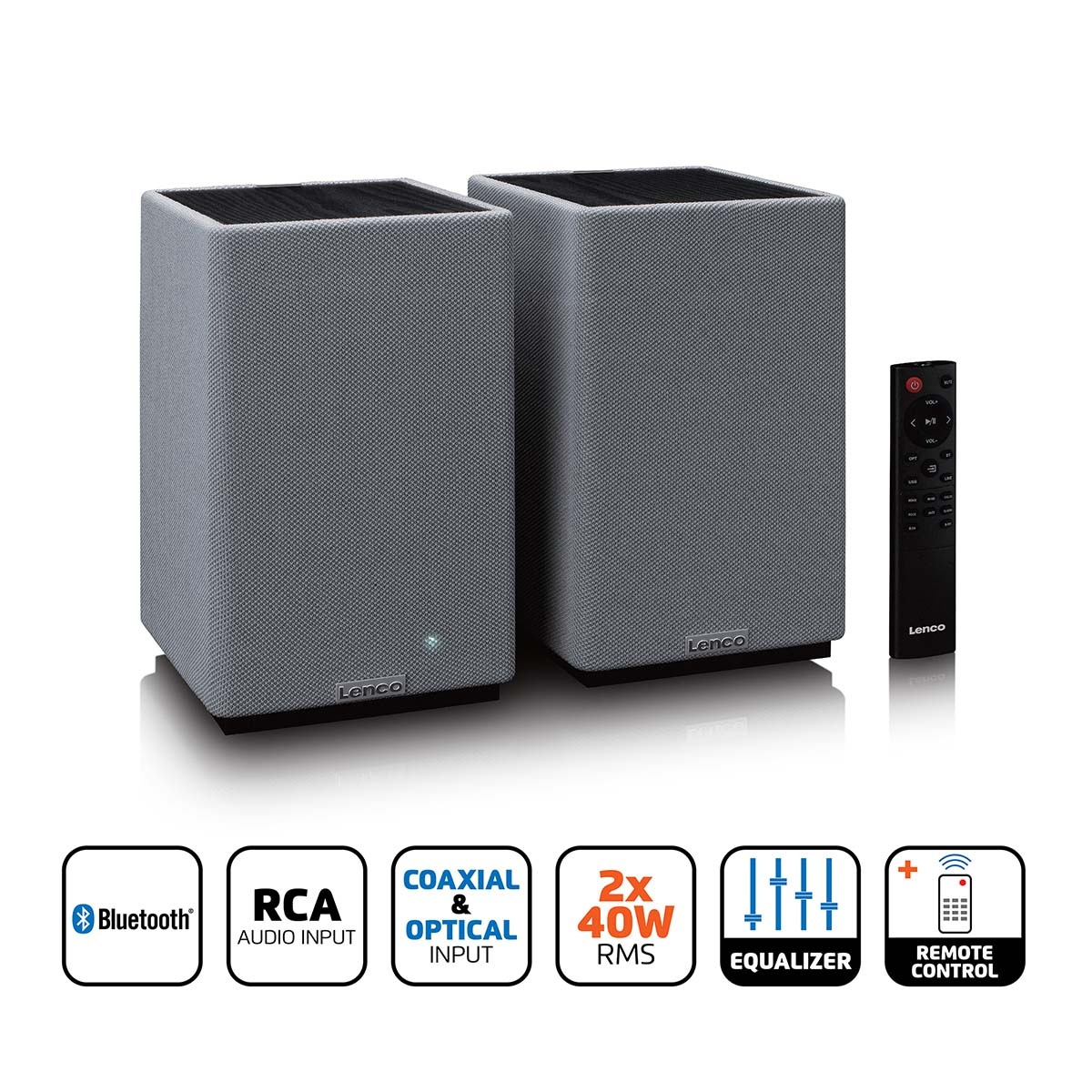 Lenco Stereo Bookshelf Speakers levereras redo att användas med en fjärrkontroll, RCA-kabel och nätadapter, så installationen är snabb och problemfri. Deras rena, moderna design kompletterar alla interiörer, vilket gör dem till ett elegant och funktionellt tillskott till alla rum.