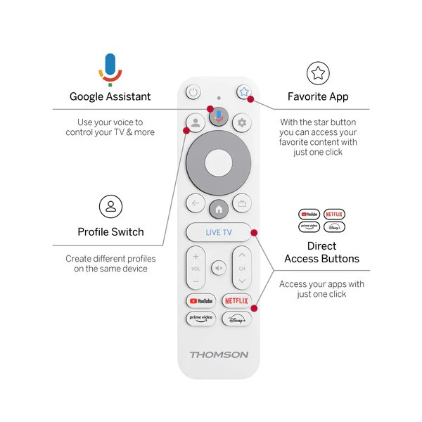 Den medföljande fjärrkontrollen är utformad för komfort och hastighet och har röststöd för Google Assistant. Säg bara vad du letar efter – från trendiga YouTube-klipp till den senaste storfilmen – och låt dongeln göra resten. Direktåtkomstknappar ger snabb åtkomst till dina mest använda appar.