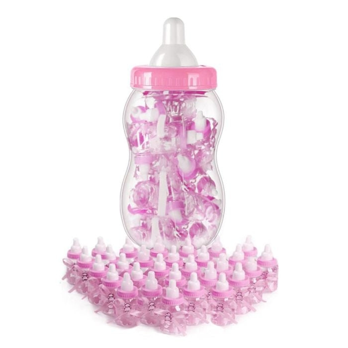 Gör din fest speciell med Mini Baby Bottle Set. Setet innehåller 30 små flaskor och en stor. Använd de söta flaskorna som bordsdekoration, mittstycke eller som tackgåva till dina gäster. Fyll dem med godis, mintpastiller, mandlar eller något annat. Du kan anpassa innehållet helt efter dina önskemål. Perfekt för babyshower, könsavslöjanden, dop eller besök efter födseln!