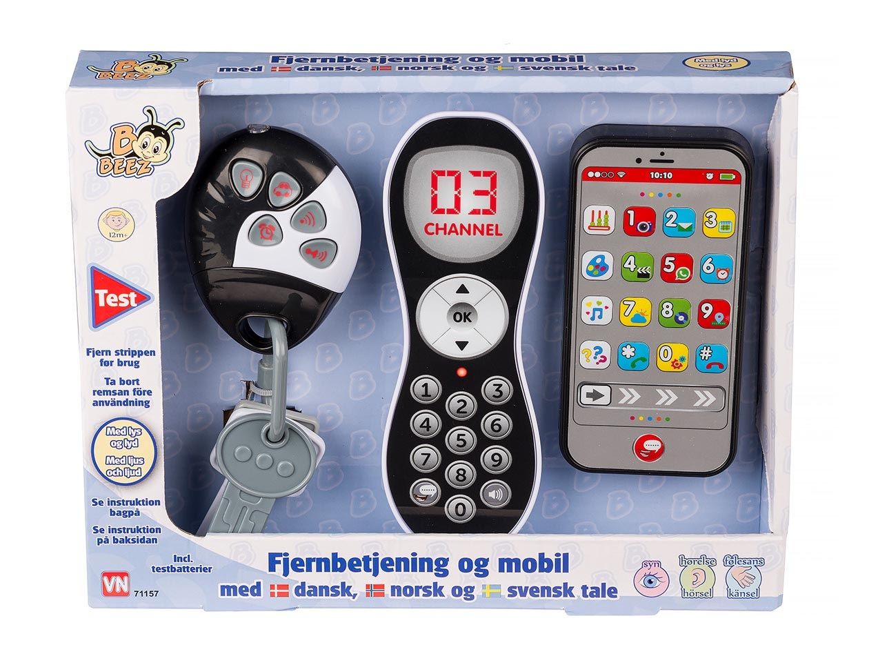 Set med fjärrkontroll och mobiltelefon med danska röster samt bilnycklar med ljus och ljud. Växla mellan danska, norska och svenska på fjärrkontrollen och mobiltelefonen. Inkl. 6 st. AAA-batterier