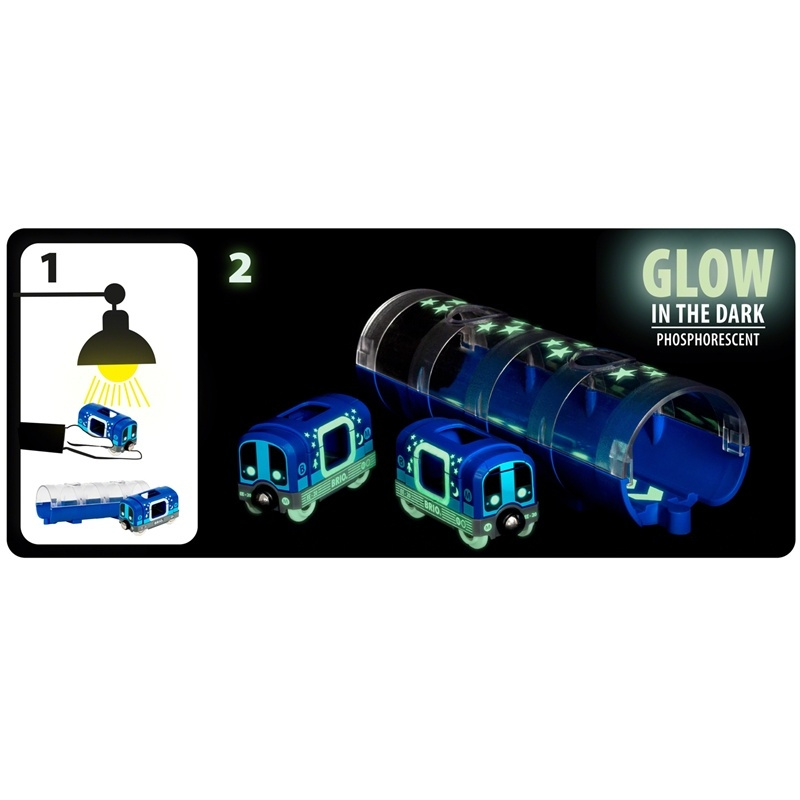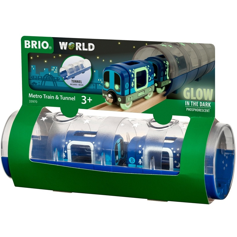 Låt ljuset skina med självlysande 33970 Tunnelbanetåg och tunnel. Det här tågsetet innehåller ett lok och tågvagn i tunnelbanestil och en tunnel med unik design – båda med självlysande grafik. Loket och passagerarvagnen kan kopplas till varandra och andra fordon med magnetkopplingar och har tilltäckligt med plats ombord för två poserbara BRIO World-figurer. Den roliga tunneln – som även fungerar som en smart behållare – har ett transparent tak så att du kan se när tåget rusar genom tunneln och lättåtkomliga funktioner för att förhindra eventuella stopp.