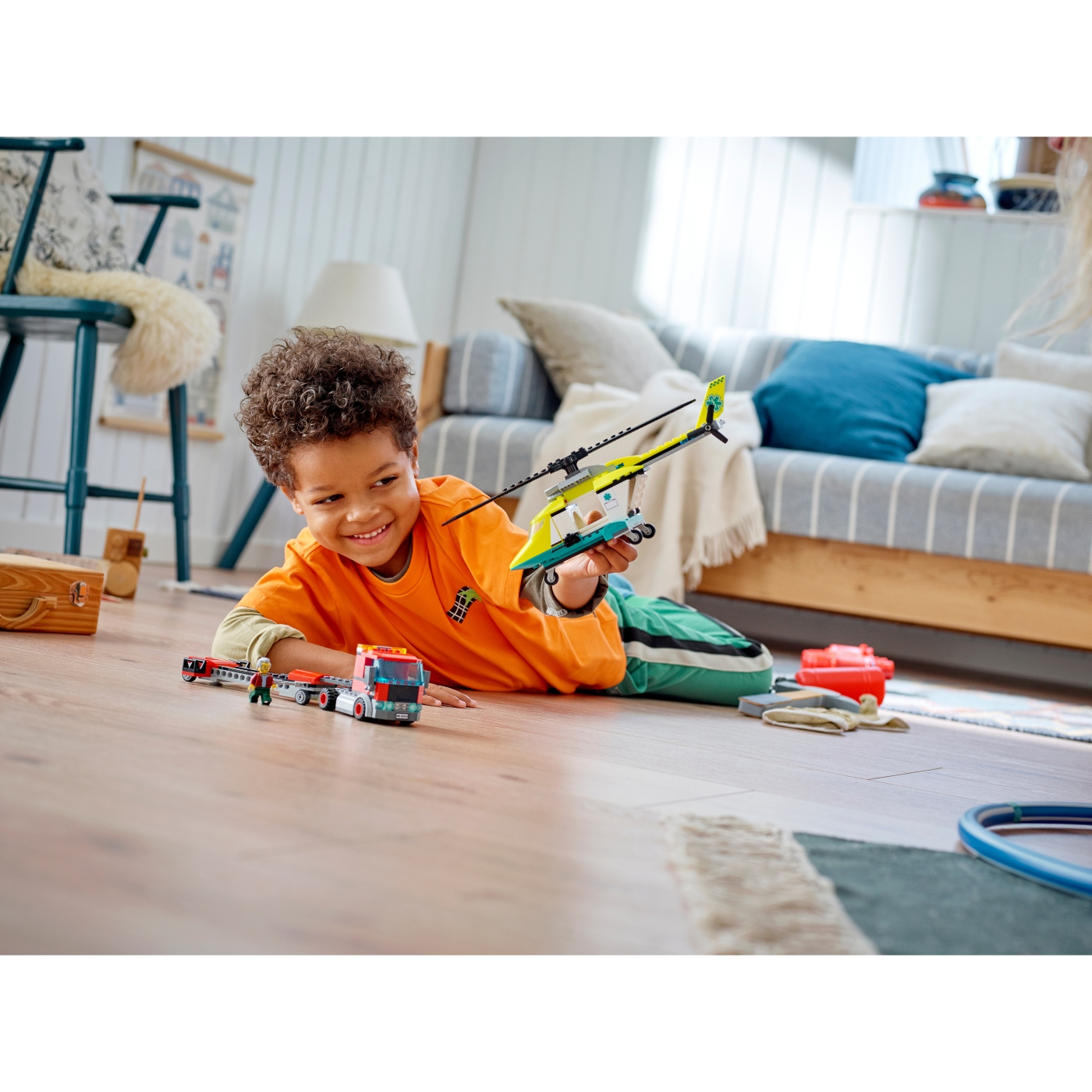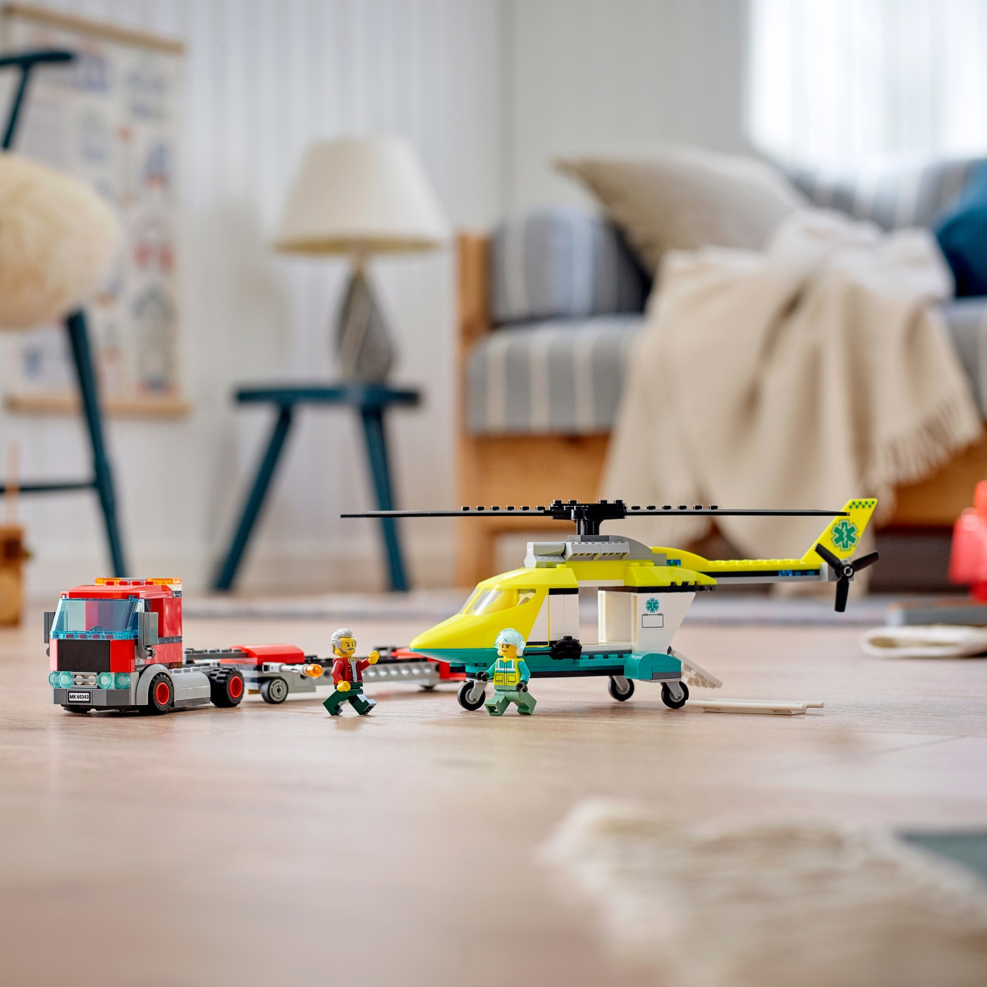 Leksetet LEGO® City Räddningshelikoptertransport (60343) innehåller en ikonisk röd lastbil med ett ledat släp med öppet flak och utfällbara varningslampor, plus en räddningshelikopter