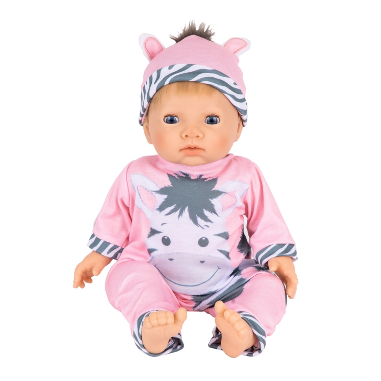 Denna underbart tillverkade Tiny Treasures babydocka är klädd i en rosa all-in-one med en söt zebragrafik och zebramönstrad kant. Outfiten innehåller också en matchande rosa jerseyhatt med öron och en fluffig tuft för extra söthet.