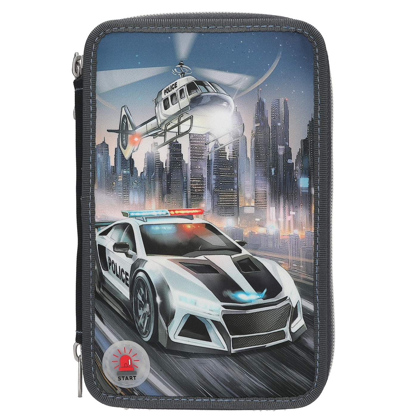 - Iögonfallande motiv: Framsidan av detta pennfodral har en dynamisk scen med en polisracerbil och en helikopter som zoomar över en nattsilhuett. Det är en design som skriker fart och spänning, perfekt för dem som älskar lite adrenalin i sin skoldag.