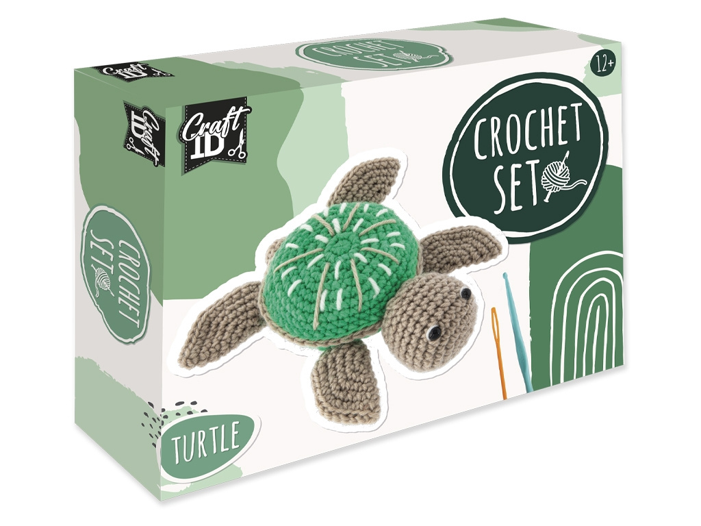 Virkningssats, sköldpadda. Det här kitet innehåller allt du behöver för att virka en sköldpadda. I kitet ingår garn i olika färger, virknål, stoppning, ögon och en nål