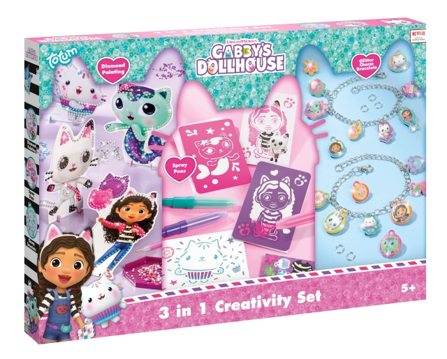 Gabby's dollhouse 3 in 1 creative set som innehåller diamantkonst, tuschpennor och ett armband med hänge.