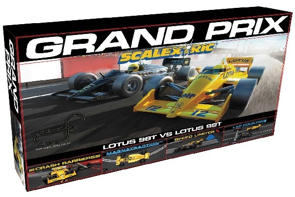 Two iconic Lotus Formula One cars of the 1980s go head-to-head in this fantastic new retro set from Scalextric! The sleek black Lotus 98T of the world-famous Ayrton Senna goes head-to-head with his amazing yellow 99T as they fight for position around the circuit, with Turbos chattering and wastegates fluttering these famous Grand Prix racers are sure to light up your circuit!