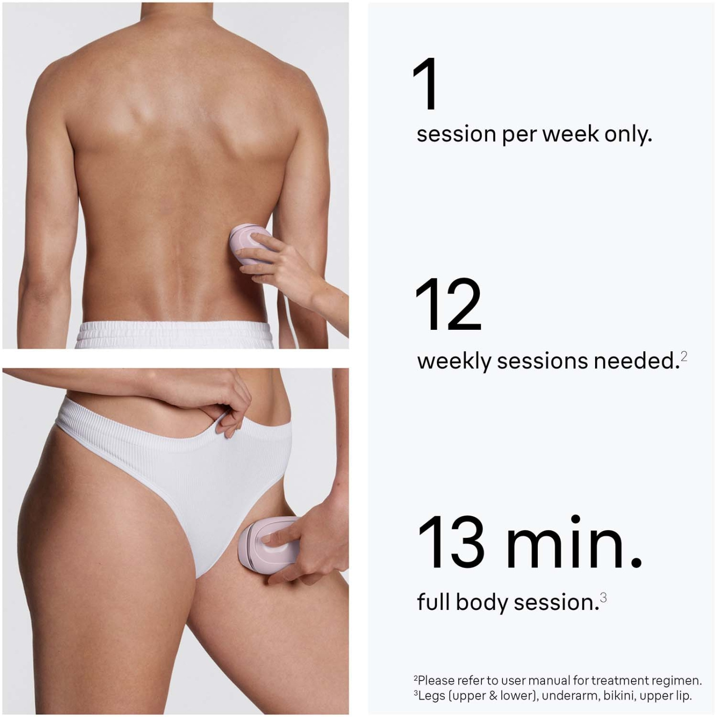 Glöm frekvent hårborttagning och alla irriterande moment som medföljer. Kliniskt bevisad effektivitet för 1 år* av len hud med synliga resultat efter den tredje behandlingen*. Dermatologiskt godkänd, ögonsäker, inga skyddsglasögon krävs. Investera en gång, hoppa över salongen, spara tusentals och få långvarigt len hud bekvämt hemma.