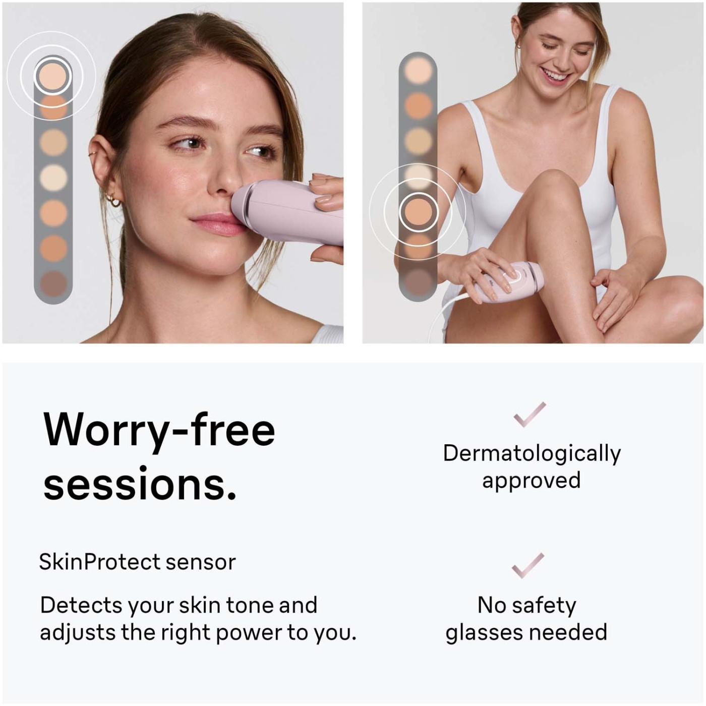- Skonsam mot huden: med hudtonssensor som läser av din hudton och automatiskt anpassar varje ljuspuls för en säker behandling, även på svåråtkomliga områden som intimområdet