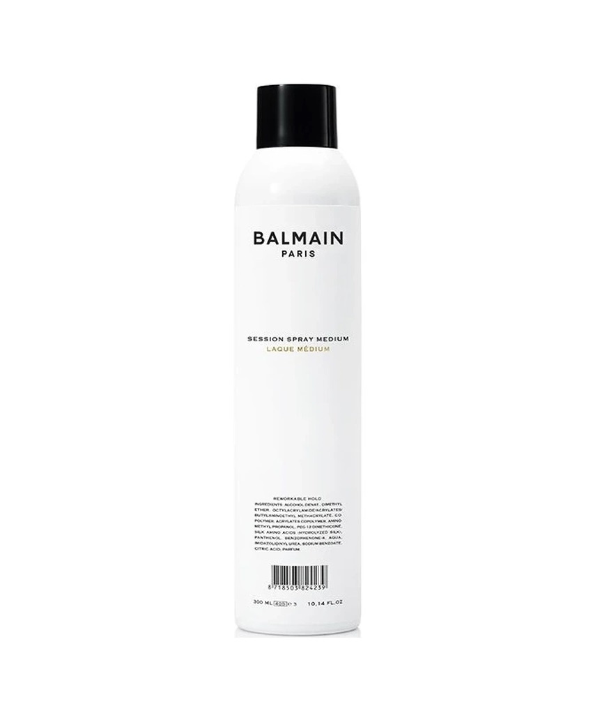 Hårspray med medium stadga. Idealisk för att omforma och styla håret. Session Spray Medium är en hårspray för efterbehandling som bibehåller elasticitet och rörelse i håret, samtidigt som den ger en långvarig kontroll. Idealisk för frisyrer med medelhög stadga och lätt att borsta ut. Ingredienserna silkesprotein och arganolja stimulerar optimal fuktretention i hårcellen, reparerar och skyddar skadat, torrt och svagt hår mot extrema förhållanden. Care-serien har en underbar signaturdoft, en unik blandning av doftnoter som förflyttar dig till den perfekta sommardagen. Varje gång produkterna används berikar de håret med närande ingredienser och ger en doft av Balmains signaturdoft.