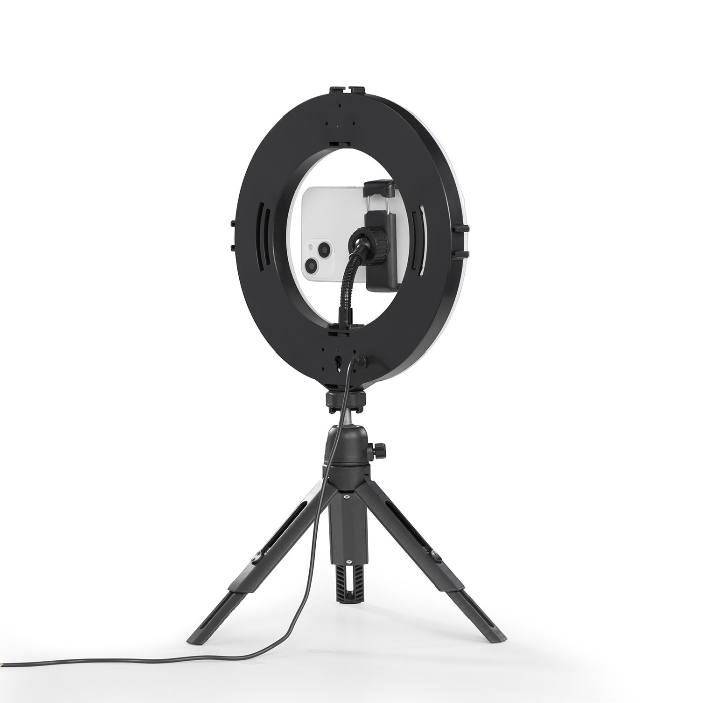 Ringljuset har ett stativkulhuvud som gör att det kan vridas och lutas för ovanliga inspelningsvinklar. Smartphonehållaren med kulhuvud och flexibel svanhals garanterar perfekt inspelningsposition i både stående och liggande format. Dessutom har ringljuset två ¼"-anslutningsalternativ och fyra anslutningar för kallsko, vilket ger flexibilitet för att kombinera och placera utrustning som webbkameror och mikrofoner, samt lägga till ytterligare tillbehör för professionella och kreativa foton och videor.