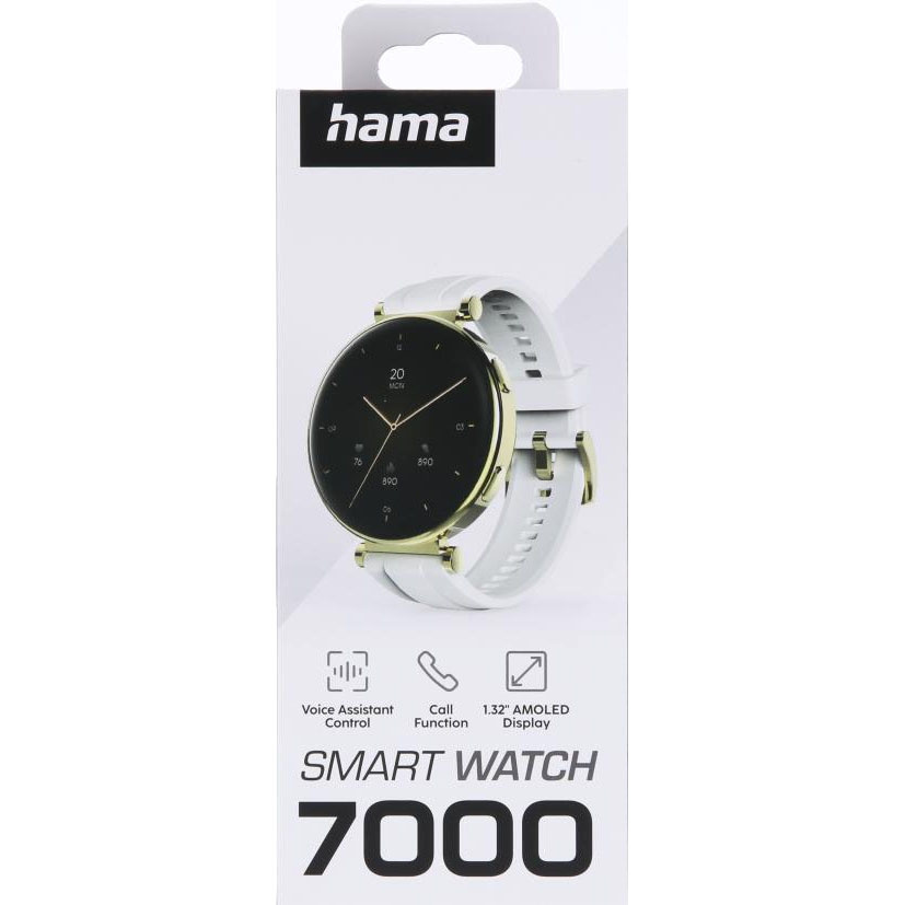 Smartklockan "7000" är en mångsidig följeslagare för både sport och vardagsliv och har ett brett utbud av funktioner för att hålla dig informerad och uppkopplad. Klockan har en stor 1,32" AMOLED-pekskärm med ett tydligt och responsivt gränssnitt för enkel navigering. Den eleganta designen med rund guldfärgad boett och vitt armband gör den till en snygg accessoar för alla kläder.