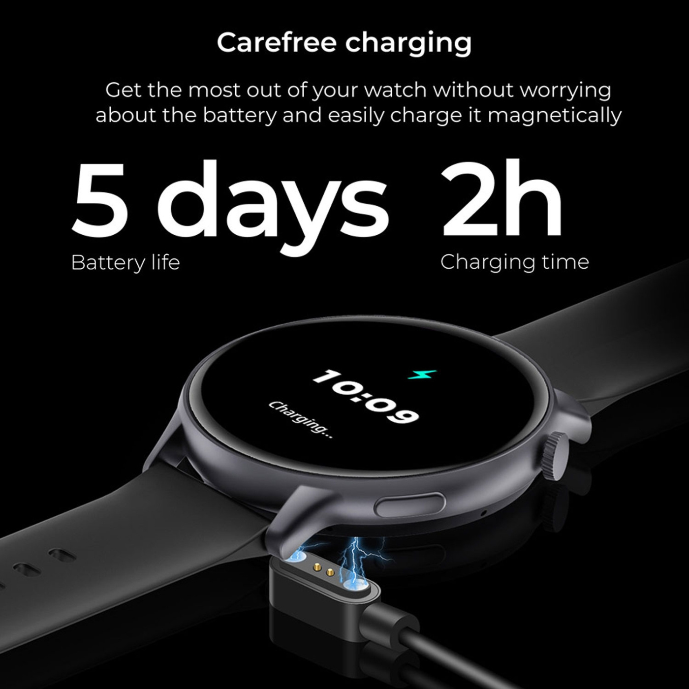 Med en 1,43" AMOLED-multipekskärm levererar den levande färger och enastående skärpa, så att du enkelt kan övervaka din hälsa och dina aktiviteter direkt från handleden. Tack vare den inbyggda mikrofonen och högtalaren kan du ringa och ta emot samtal samt aktivera röstassistenter för smidig hantering av dina dagliga uppgifter.