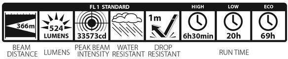 Prestanda enligt ANSI FL1-standarden: ljusområde 323 m, ljusflöde 487 lumen och ljusintensitet 26 139 candela. Brinntid vid Full Power-inställning 6 h 30 min, vid Low Power-inställning 20 h och vid Eco-inställning 69 h (med 10% av den ursprungliga ljusstyrkan kvar). Stänksäker IPX4, stöttålig 1 m.