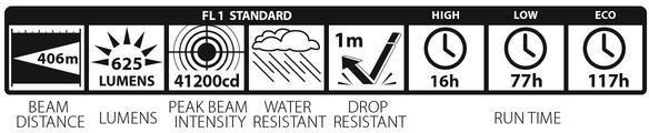 Prestanda enligt ANSI FL1-standarden: 403 m ljusområde, 625 lumen ljusflöde, 40 596 candela ljusintensitet. Brinntid på Full Power 32 h, på Low Power 112 h och på Eco 298 h (med 10% av den ursprungliga ljusstyrkan kvar). I praktiken kommer armaturen att brinna kontinuerligt dag och natt i ungefär ett par veckor med en användbar ljuskägla tills batterierna når 0,99 V, vilket gör den till den mest energieffektiva armaturen i sin storlek på marknaden). Stänksäker IPX4 och stöttålig upp till 1 m.