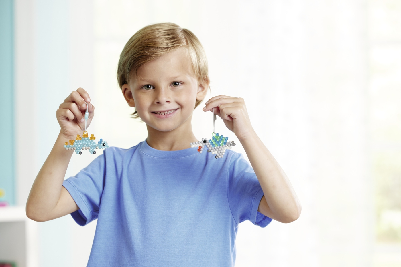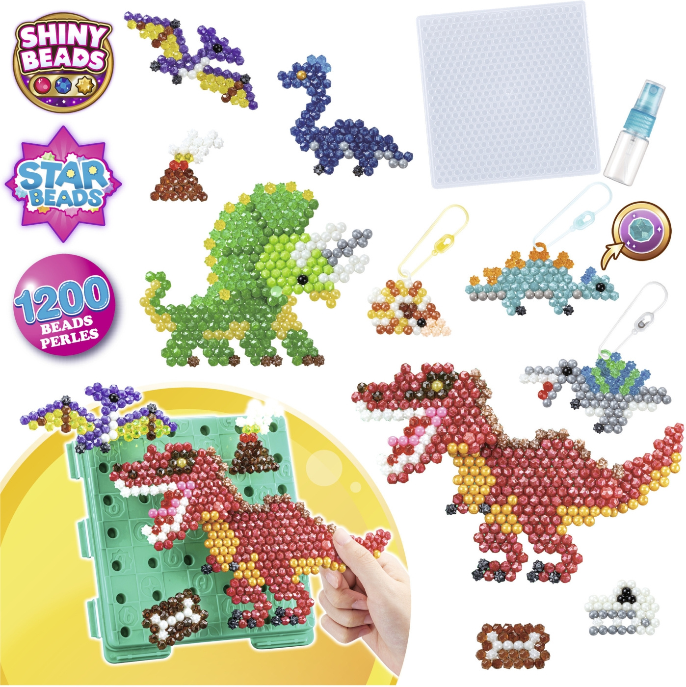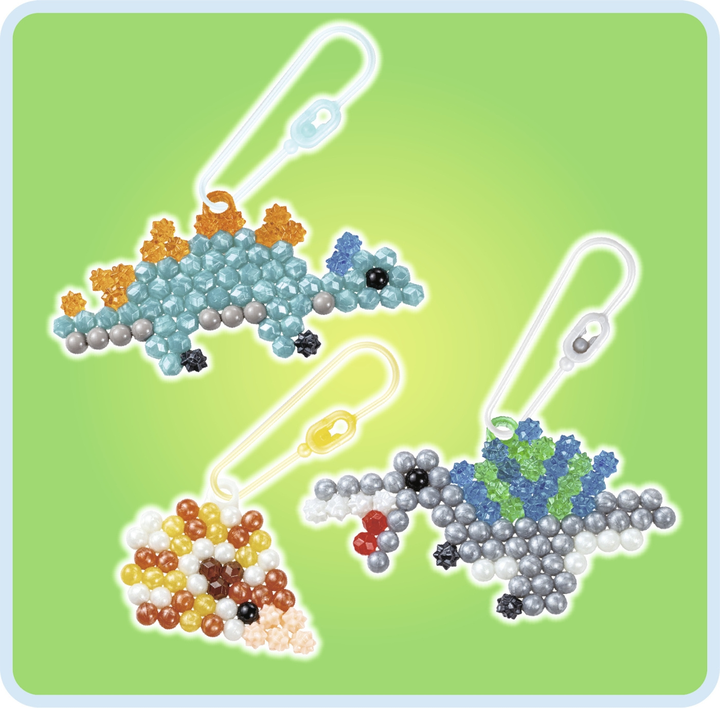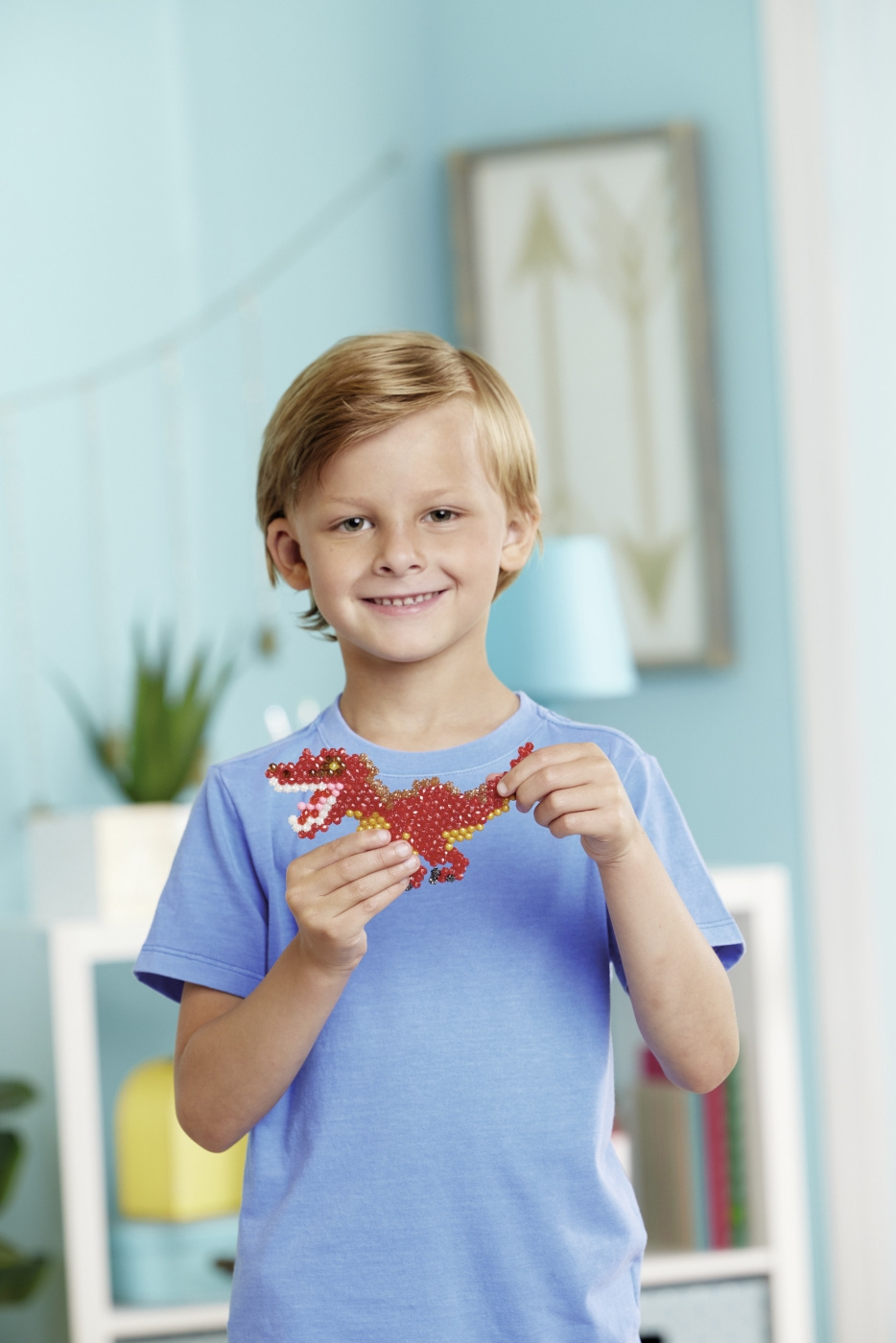 Skapa förhistoriska dinosaurier med Aquabeads Dinosaurie - pärlset. Setet innehåller totalt 1200 färgglada pärlor, varav vissa är specialformade glanspärlor. Med en separat layoutplatta och mallbilder kan spännande flygödlor och köttätare skapas. Med de medföljande nyckelringarna kan färdiga skapelser fästas på en ryggsäck eller nyckelknippa. Dinosaurierna blir en rolig dekoration i barnrummet när de fästs på ett dekorationsbräde med pluggar. Roliga pysselstunder!