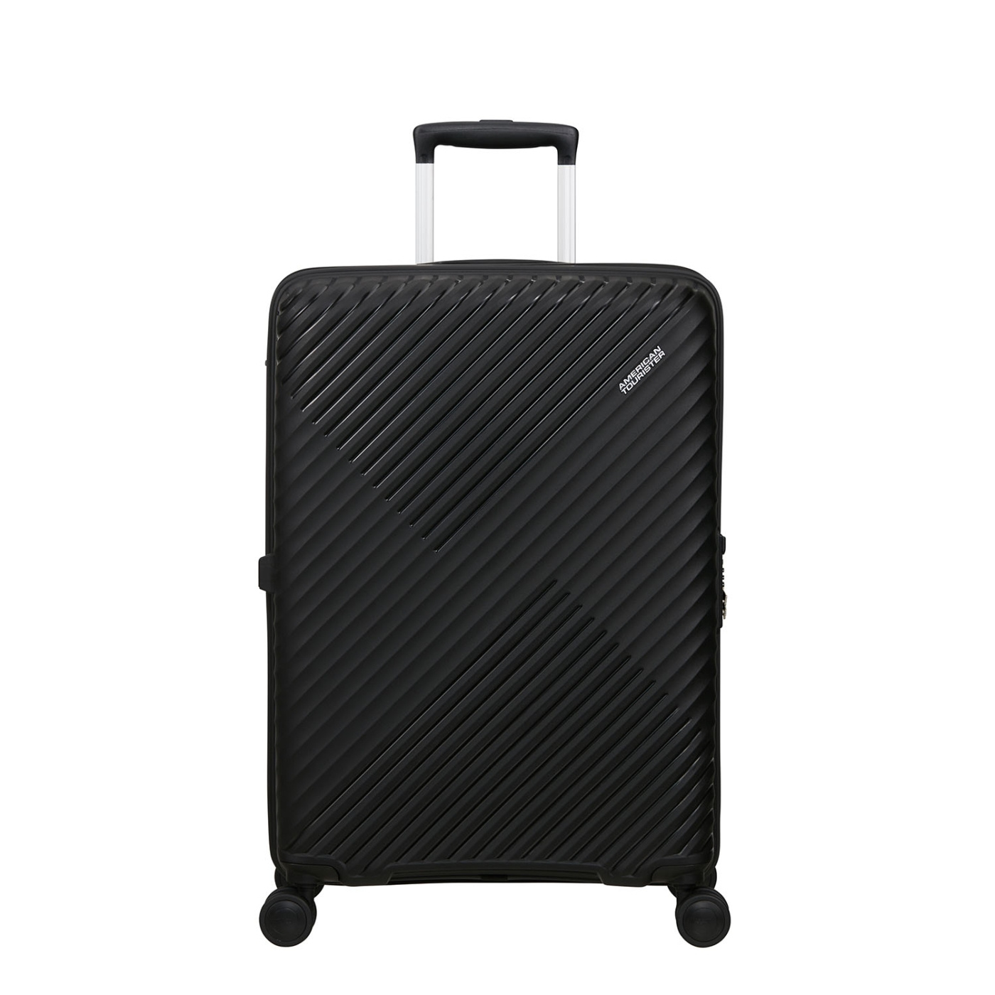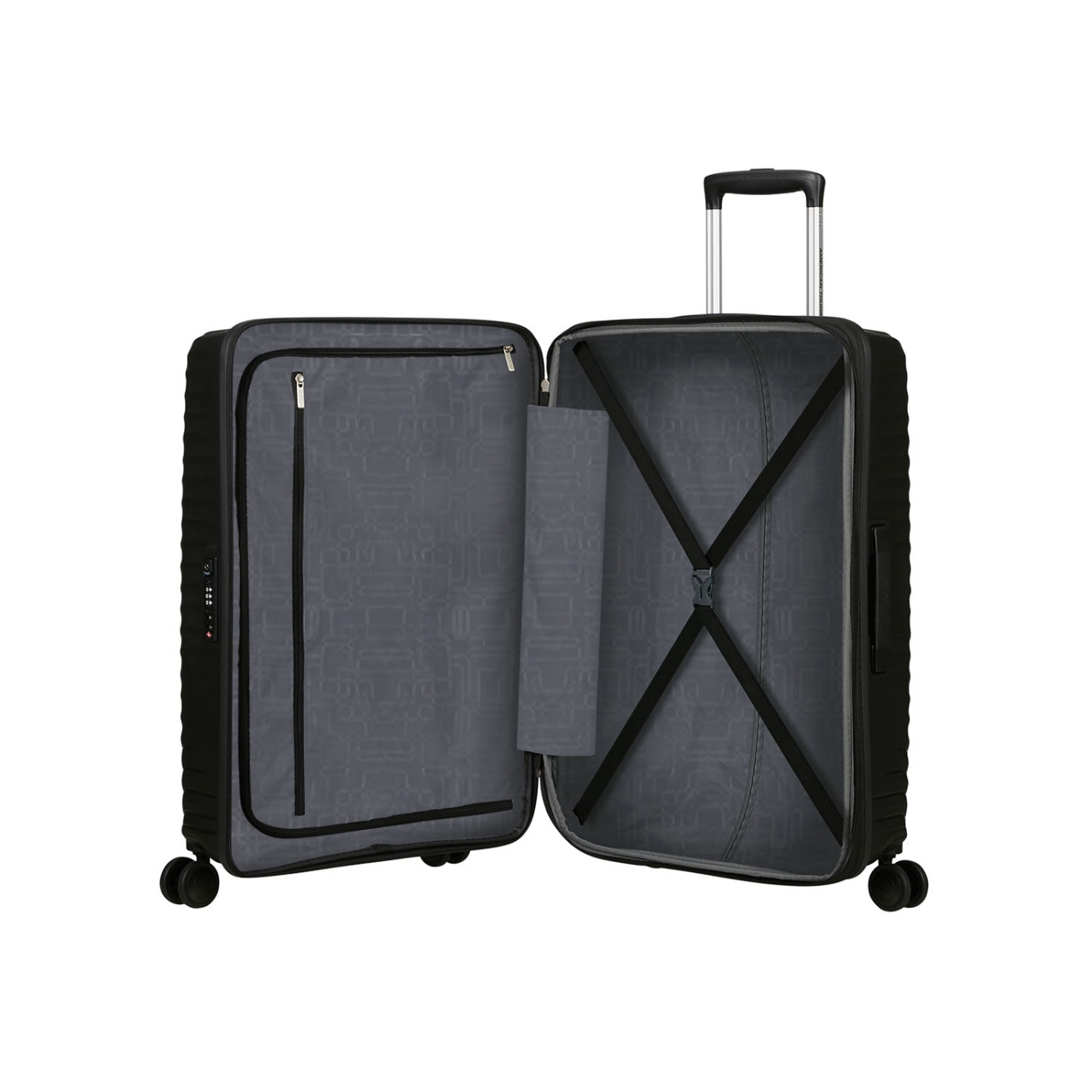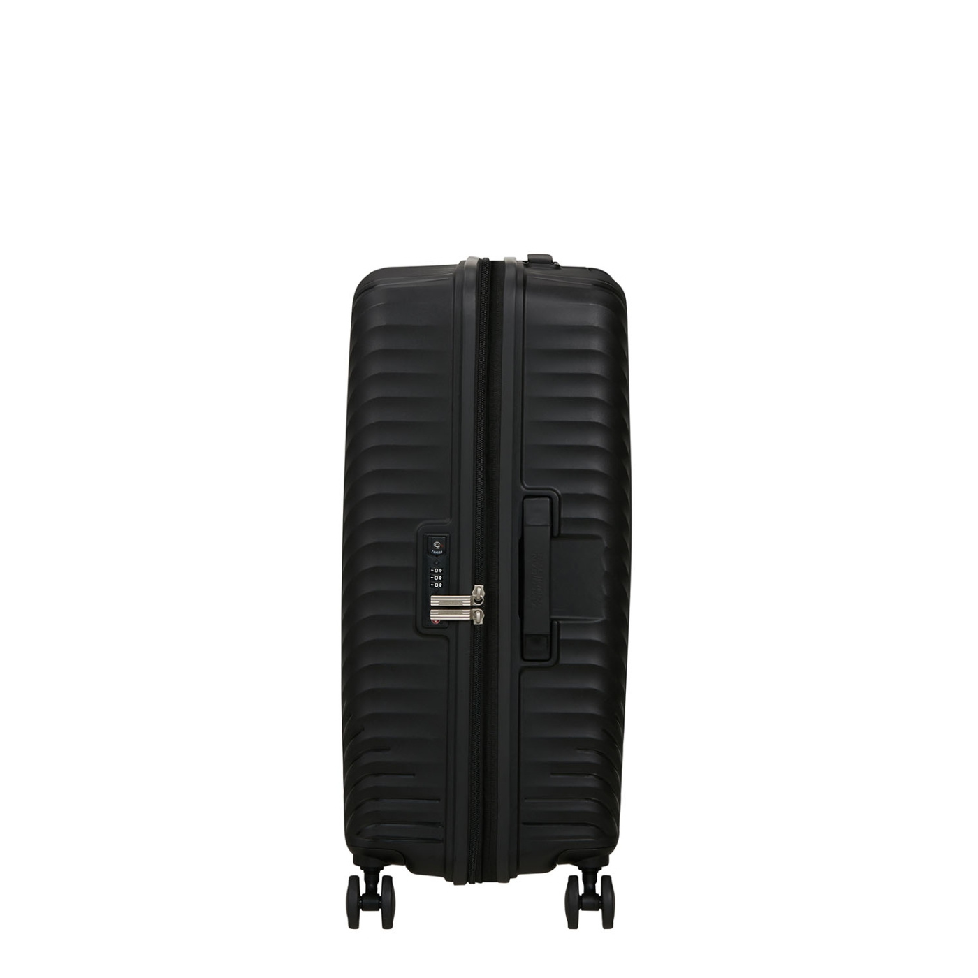 Denna resväska från American Tourister har utökad kapacitet och säkra resefunktioner.
