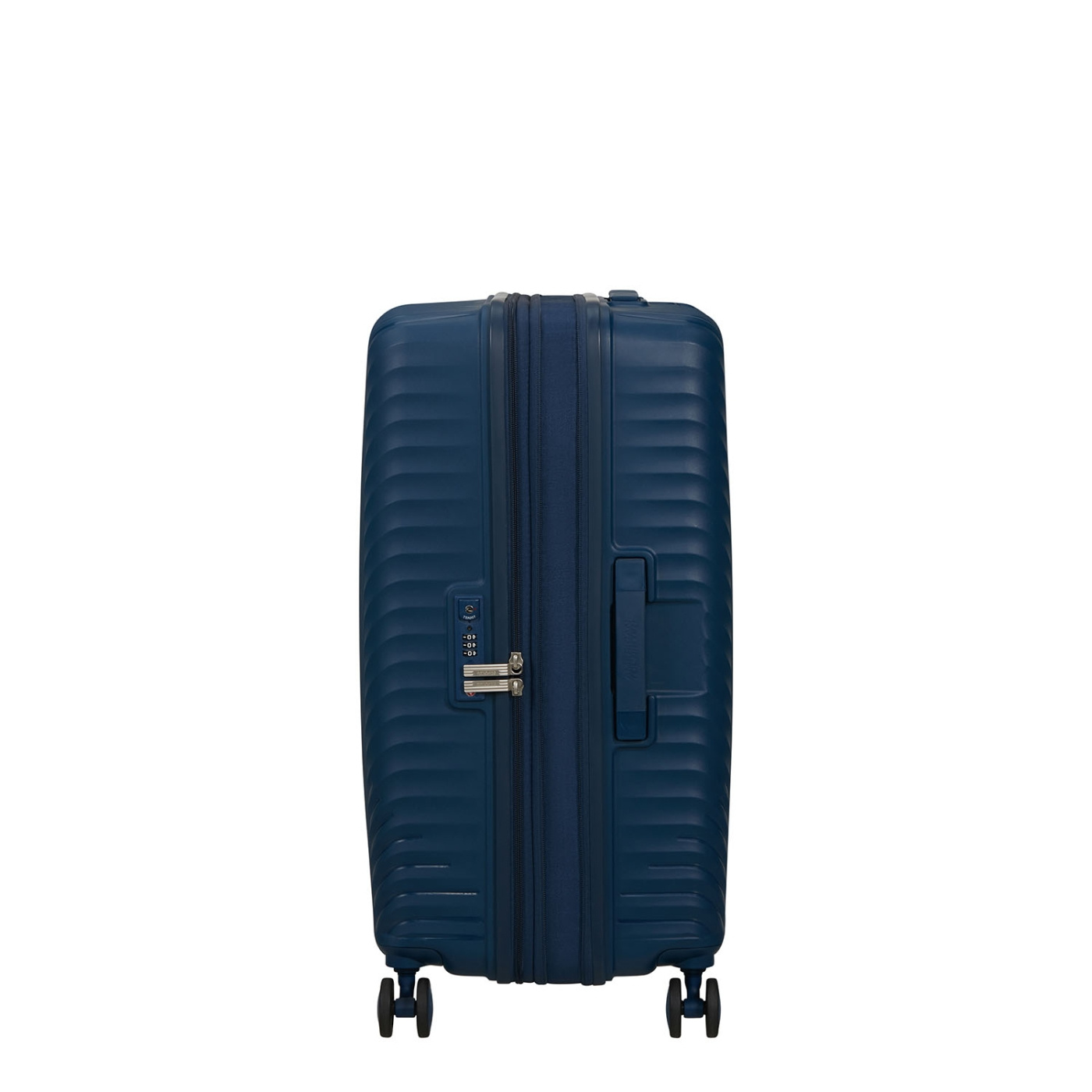 Denna resväska från American Tourister har utökad kapacitet och säkra resefunktioner.