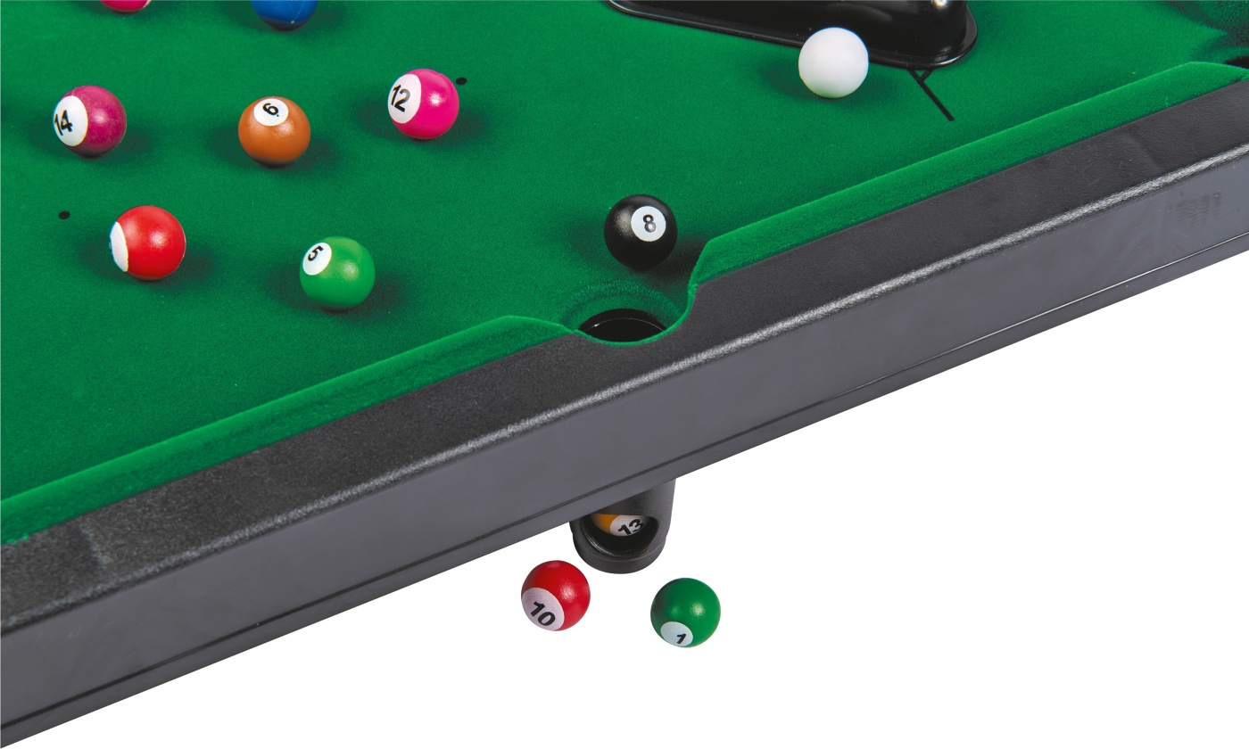 Bordsmodell miniatyrversion för små biljard- eller snookerturneringar. 16 biljard- och 17 snookerbollar och två pinnar ingår. Kul tidsfördriv för två spelare över 4 år.