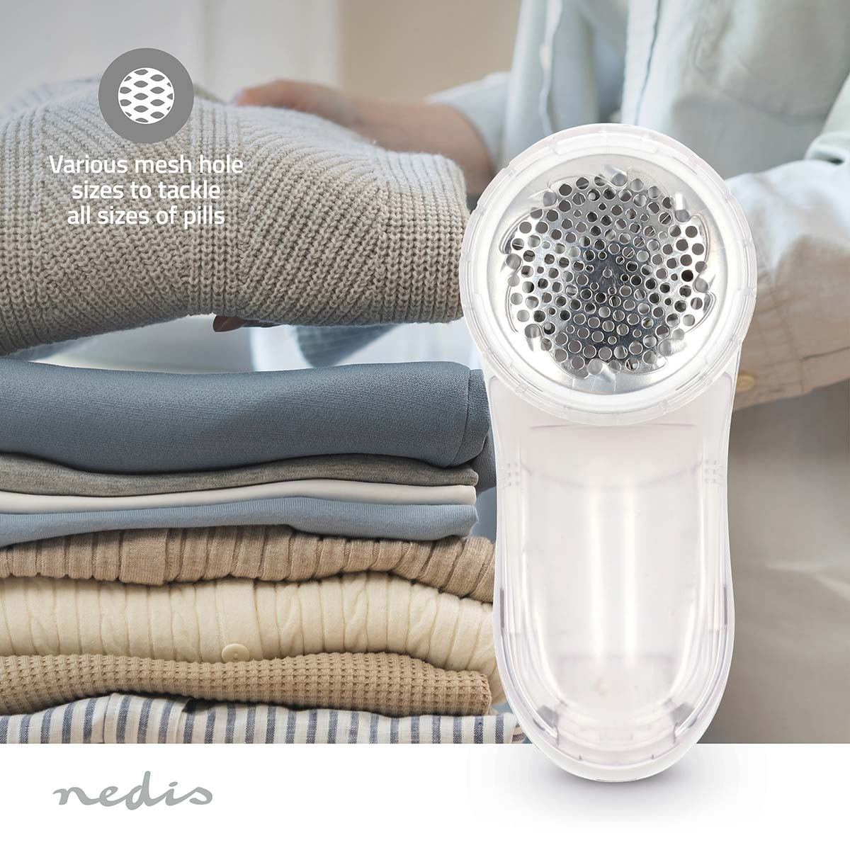 Behållaren som samlar upp borttagna piller är lätt att ta loss och tömma, vilket gör underhållet snabbt och smidigt. Ett genomtänkt utformat nätöverdrag har olika hålstorlekar för att hantera piller av olika dimensioner. För extra försiktighet på fina plagg ingår ett höjdjusterbart lock som ger extra skydd under användning.