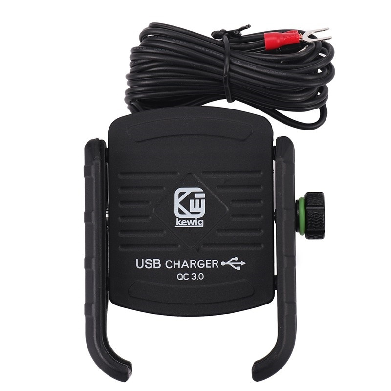 Tillverkad för att monteras på styret på en motorcykel, Den robusta designen gör att den är mycket tålig och klarar vibrationer och håller samtidigt ett fast grepp om din mobiltelefon. Kompakt och vibrationsdämpande design gör att mobilen vibrerar extremt lite när du kör. Håll dig uppdaterad och använd din mobiltelefon som gps eller styr dina spellistor. Med en inbyggd QC3.0 snabbladdar funktion kan du ansluta en USB kabel och alltid ha en fulladdad telefon. 360-graders rotation för olika betraktningsvinklar. Enkel skruv funktion för ta av och sätta dit mobilen, universal design kan användas med olika smartphones från 4 till 7 tums skärmar. Mobilhållaren levereras med en plus och minus kabel som kopplas direkt på motorcykelns batteri för laddfunktion.